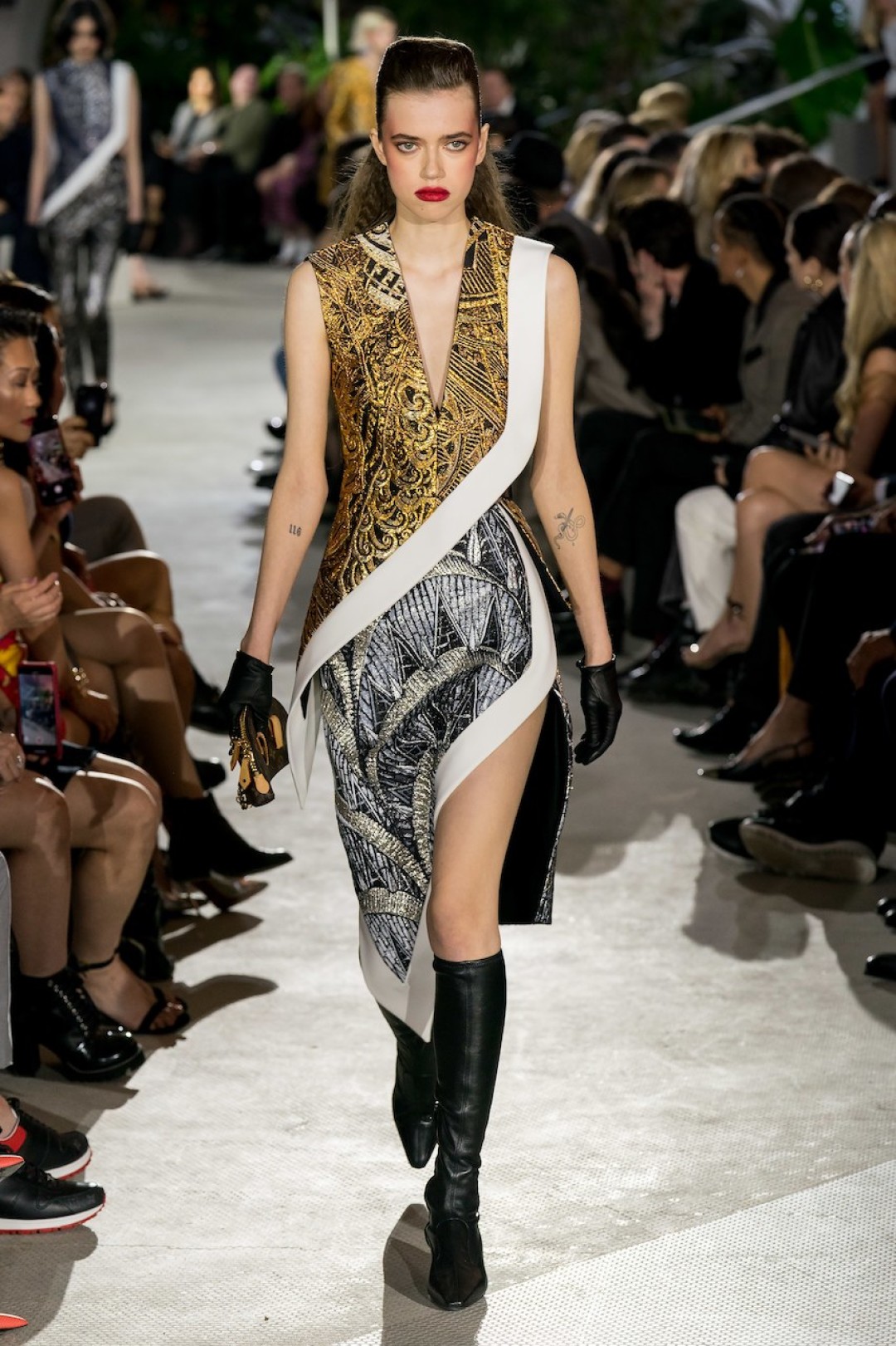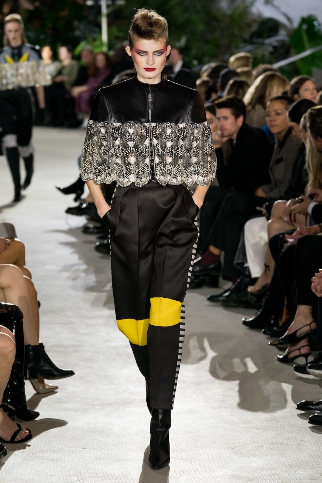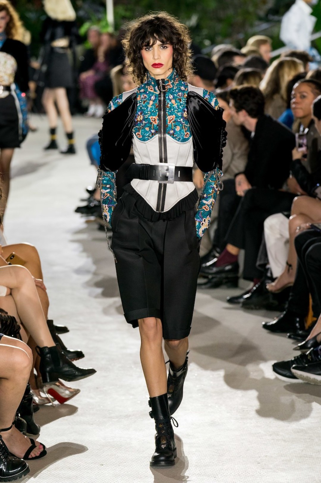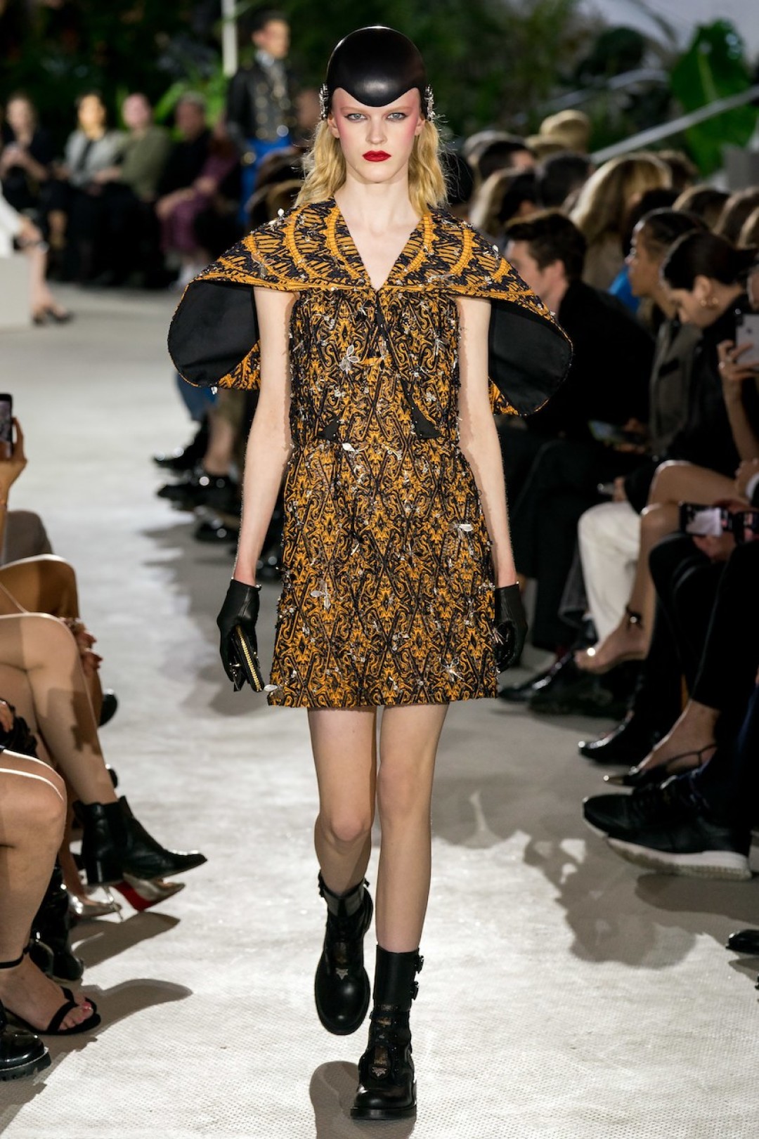 Стайлинг коллекции делали кожаные перчатки, грубые ботинки, массивные украшения и каски фигурной формы, но главное – фирменные сумки Louis Vuitton, на которых теперь расположены голограммы с видами Нью-Йорка, как дань локации прошедшего показа. Хотим все!