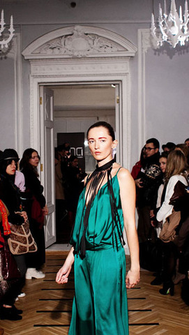 Еще один блок составлен из платьев и костюмов с юбками в пол. К черному и красному дизайнеры добавляют изумрудный и белый. Готику сменяет модерн, и дерзкие, неприступные девушки в финале оказываются нежными, теплыми и душевными - так и бывает обычно в жизни.