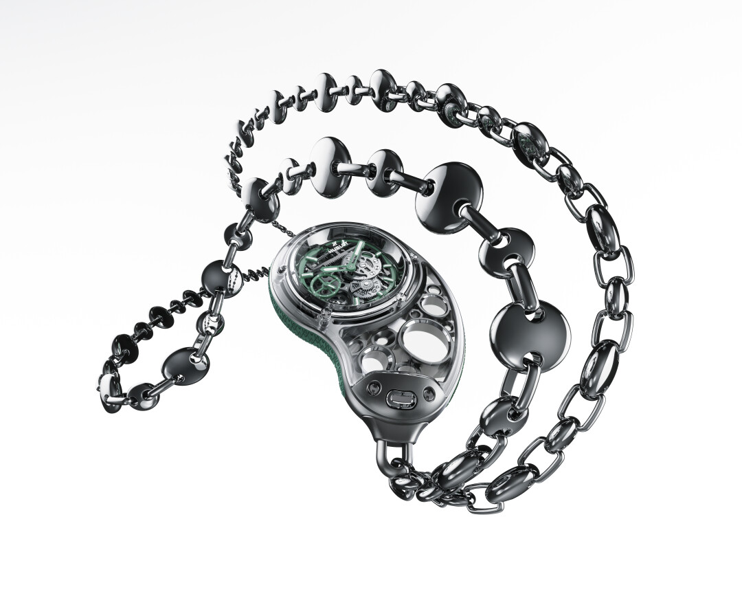 В сердце ARSHAM DROPLET бьется культовый мануфактурный механизм Hublot, калибр Meca-10 с 10-дневным запасом хода. Дополненные титановой цепочкой, часы живут сразу в трех измерениях: ювелирном — как подвеска, часовом — как карманный аксессуар, интерьерном — как настольная скульптура (на зависть гостям!). Бонус для коллекционеров: модель существует в количестве всего 99 экземпляров.