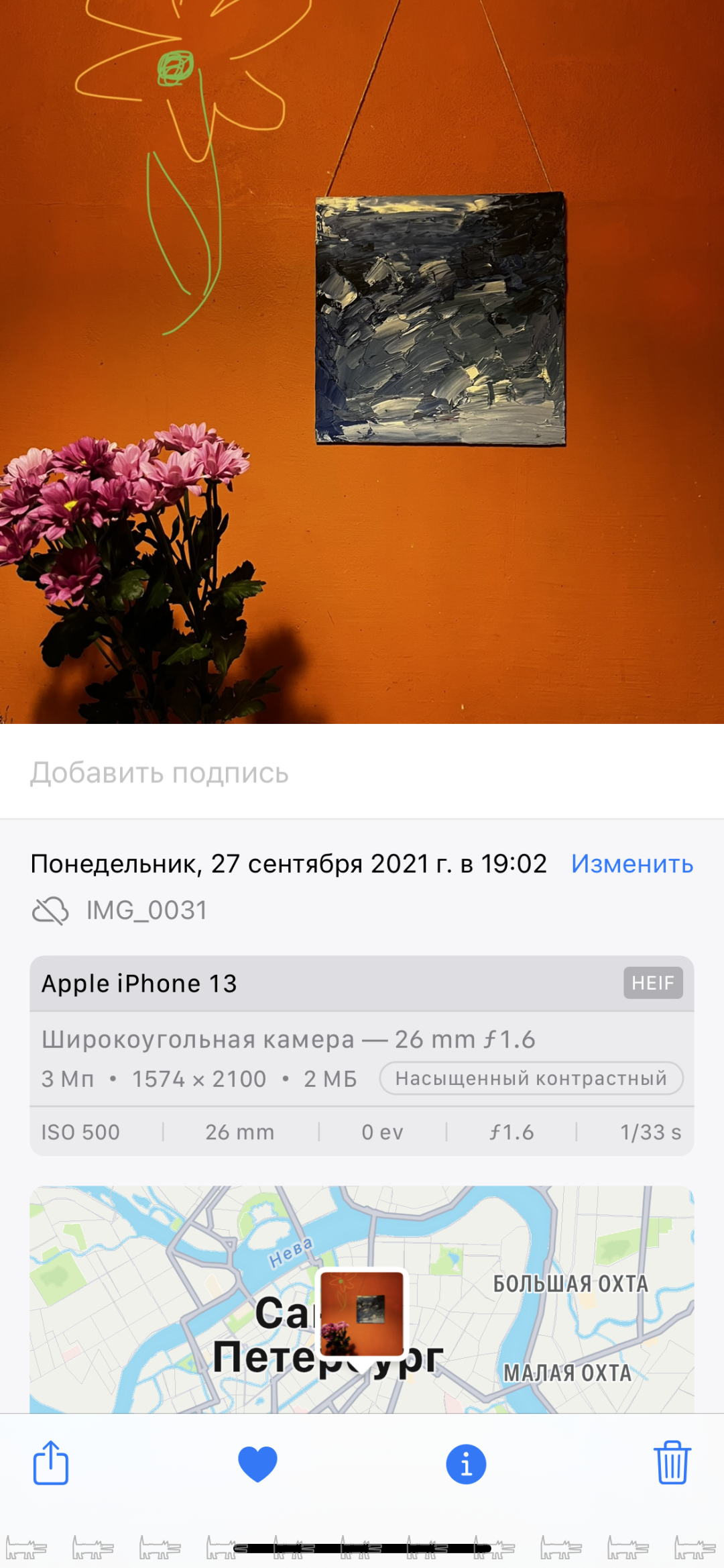 iOS 15 также дает несколько новых возможностей для тех, кто использует iPhone скорее как камеру, нежели средство связи. В панели информации теперь можно узнать модель камеры и объектива, длительность выдержки, размер файла и другие сведения о фото. В воспоминания можно добавлять музыку из Apple Music. А еще то, что понравилось лично мне — в той же вкладке «Править» можно рисовать! Без Apple Pencil получится слегка коряво, но даже пальцем удастся превратить снимок в цветущий сад.