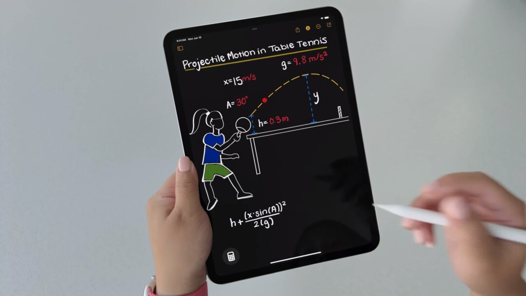 Одно из самых впечатляющих обновлений — новые возможности заметок, делаемых при помощи Apple Pancil. Теперь, нейросеть автоматически распознает текст, который написан от руки с помощью стилуса, делает почерк более разборчивым (сохраняя его индивидуальность). При этом для рукописного текста доступны: проверка правописания, редактура (включая вставку или удаление кусков текста). Более того, встроенный калькулятор (теперь он появился в планшетах Apple!) может решать математические задачи, написанные от руки, и даже решать физические задачи, на основе графиков и чертежей.