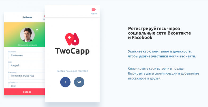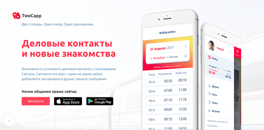 Разработчик Роман Василенко совместно с петербургской дизайн-студией Molinos создал приложение Two Capp, с помощью которого можно планировать встречи, находить друзей и устанавливать деловые контакты на рейсе в поезде. Приложение доступно для пользователей смартфонов на базе iOS и Android.