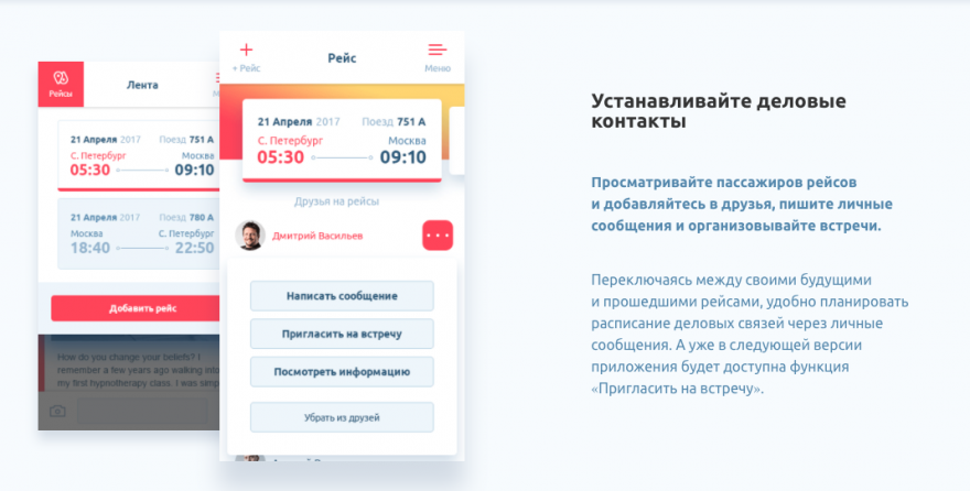 Переключаясь между будущими и прошедшими рейсами в приложении, можно планировать расписание деловых связей. Вне поезда общение не прервется — приложение информирует о непрочитанных сообщениях или новых заявках в друзья.