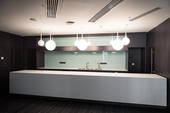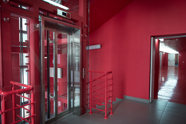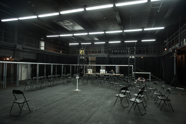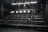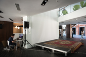 Зрительный зал расположен прямо над медаицентром и выглядит скромно: черный бокс с выдвижными квадратами сцены и зрительскими местами (до 300 посадочных). Помещение легко трансформируется — в арену, пространство для дефиле, классический амфитеатр (всего 14 вариантов). Жалюзи на окнах убираются, чтобы пропускать дневной свет.