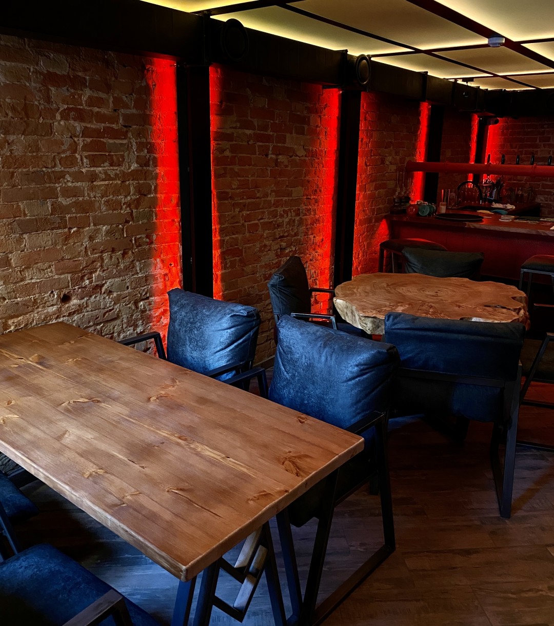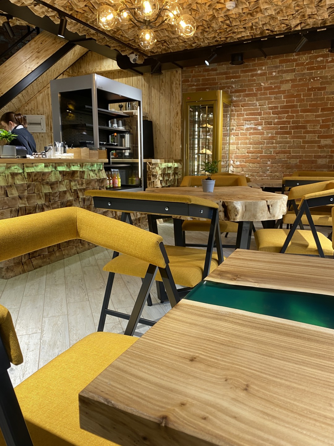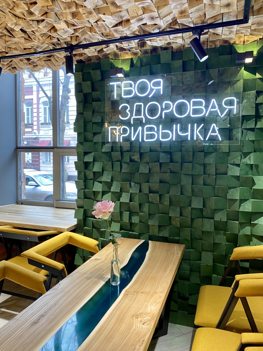 Полная противоположность своего соседа – территория здорового питания «FoodStore». На небольшой площади расположилась территория правильного питания и две удобных co-working зоны. В зале аромат 6 800 срезов натурального дерева, использованного в интерьере.