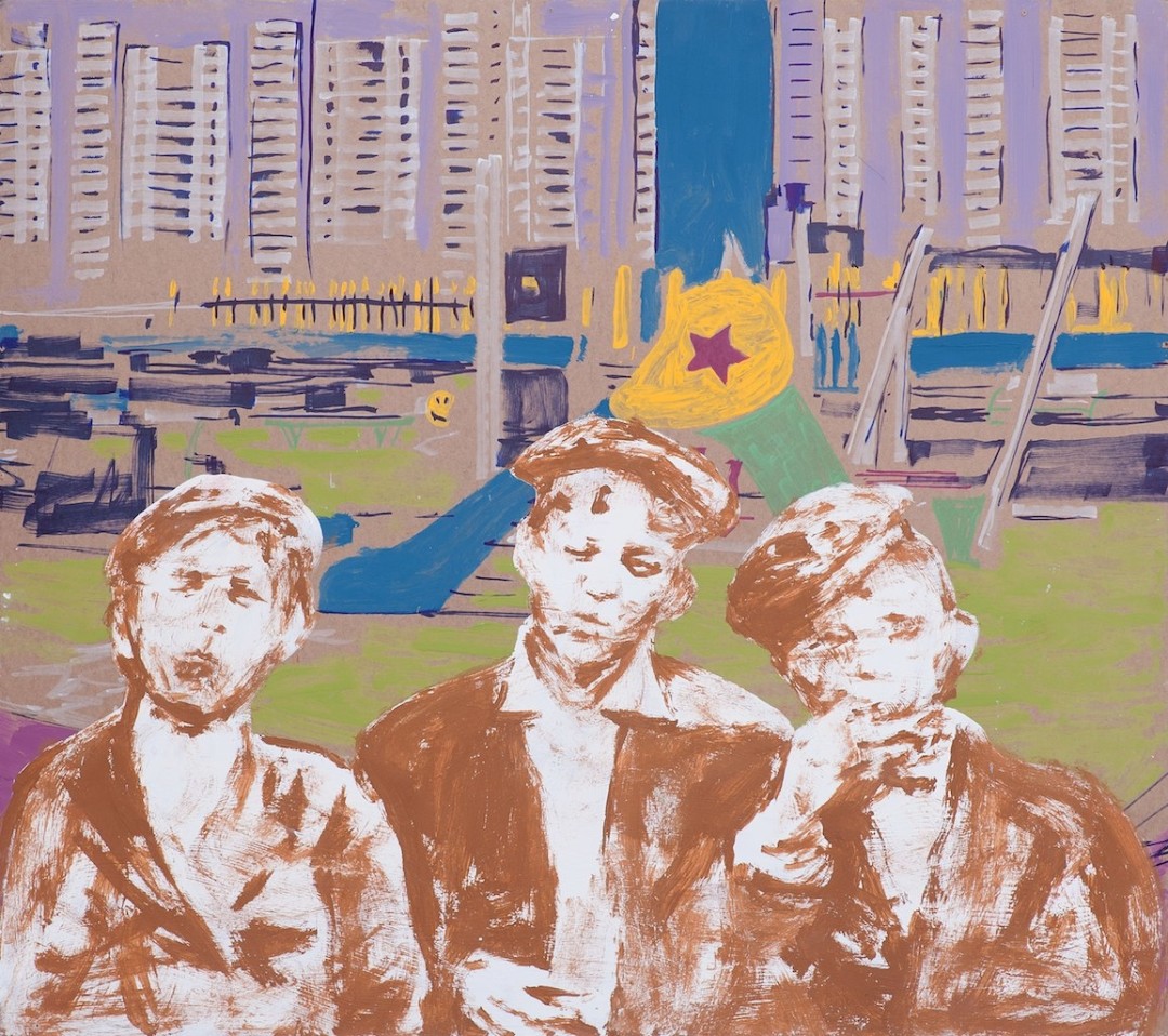 Несколько выставок делали во дворе клуба Cuba Libre (для нас это было культовое место). В 2012–2013 гг. состоялась первая выставка в «Макаронке», которая называлась «Протокол одной прогулки». Она была посвящена дому-гиганту 1925 года постройки, расположенному на Профсоюзной, возле памятника Стачке 1902 года. Это один из домов-коммун советского утопического проекта. Я провел там детство. «Протокол одной прогулки» включал около 30 масштабных живописных и одну видеоработу. Мы взяли фактуры дома (надписи, граффити, текстуры стен, найденную ветошь) и сделали коллаж из значимых образов, составили портрет воспоминаний об окрестностях.