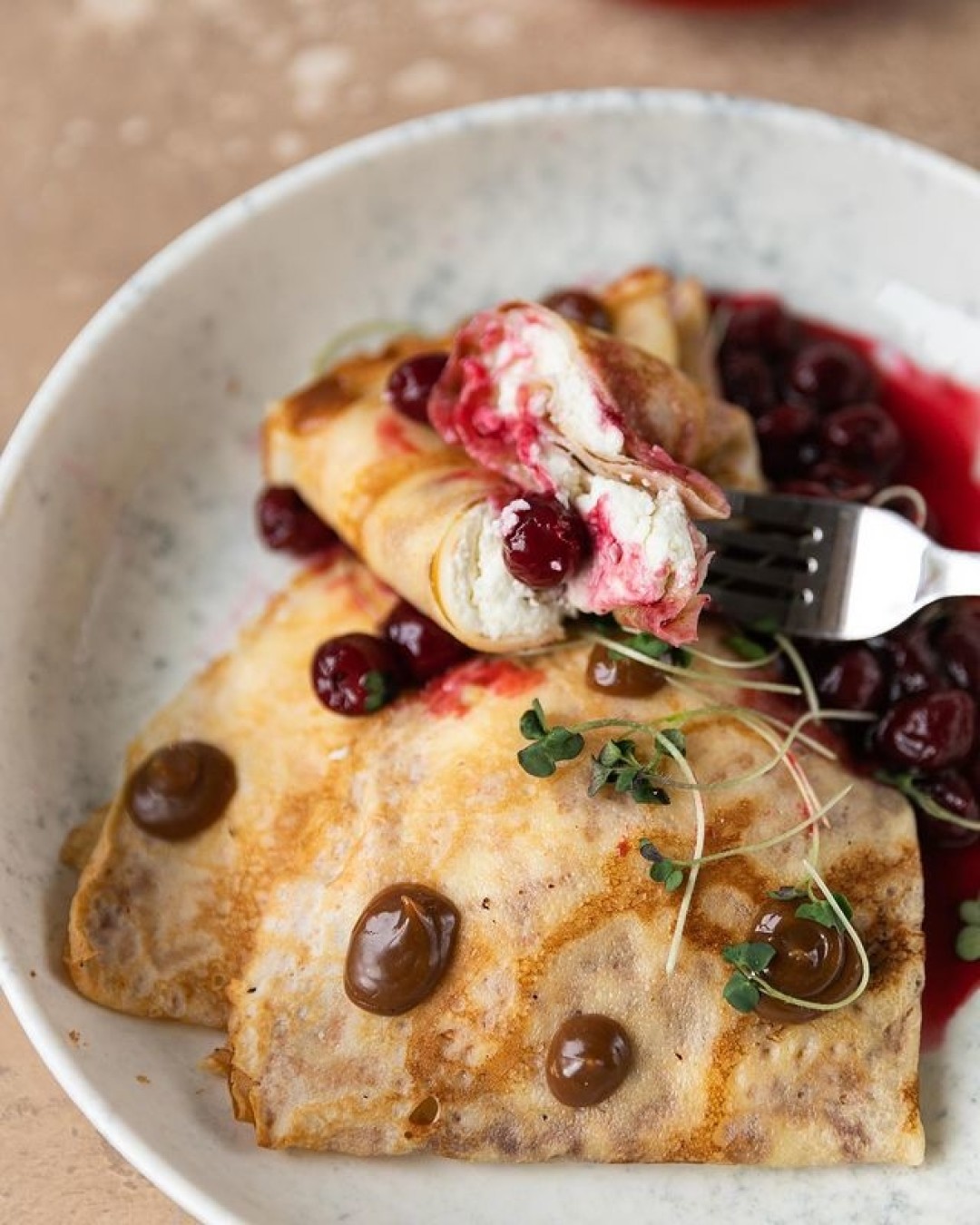 «Эклерная» приготовила все самое изысканное: блины с творогом и брусничным вареньем (319 рублей), с лососем и тар-таром (320 рублей), с заварным кремом и сливочным сыром (399 рублей), с рикоттой и шпинатом (420 рублей), с мясом и эспумой из сметаны (630 рублей), с тремя видами икры (630 рублей) и с гребешком и тыквенным пюре (850 рублей).