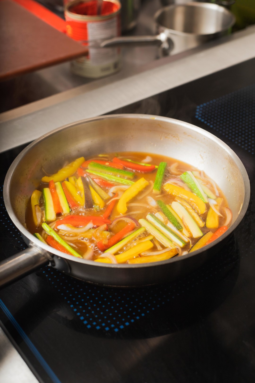 На одну порцию порежьте овощи соломкой по 30 г. Обжарьте их до состояния аль денте 5-7 минут на оливковом масле, под конец добавьте немного кинзы.