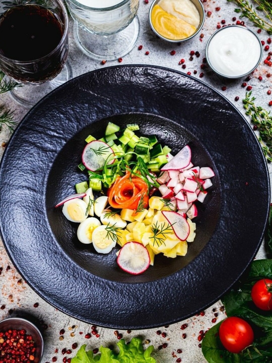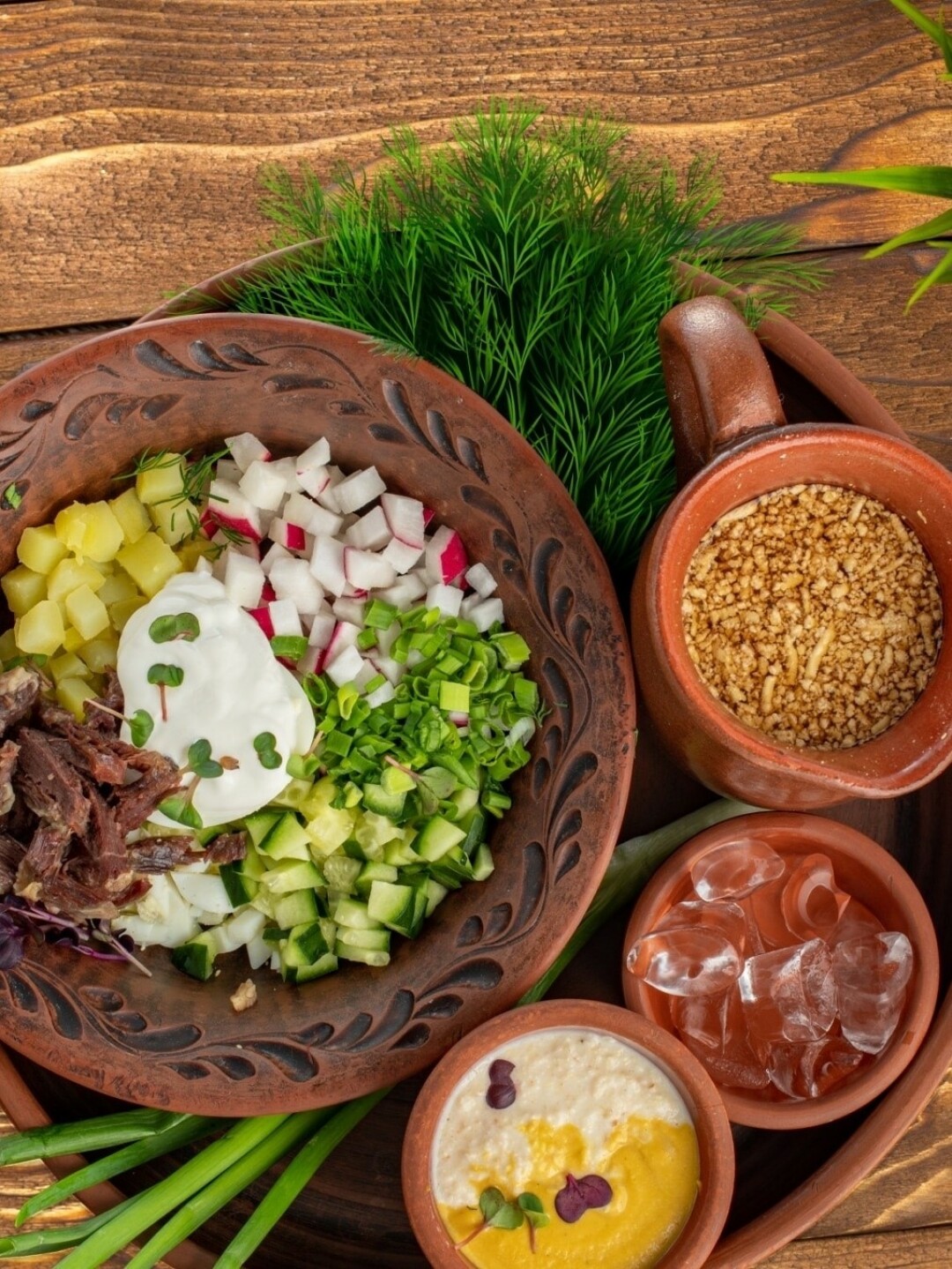 Окрошка — вообще-то блюдо истинно славянской кухни, потому искать его нужно в меню «Корчмы Гопак». Здесь этот холодный суп готовят исключительно на квасе, зато предлагают три варианта начинки за 490 рублей — говяжий язык, говяжьи щечки, куриная грудка. Бонусом с теми же вариантами начинки можно заказать холодный борщ за 550 рублей: его готовят с кефиром и газированной водой и подают с горчицей, хреном и пампушками.