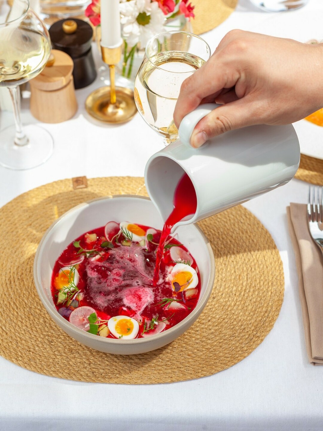 Ресторан в здании Кухмистерской фон Вакано с авторской кухней от обладателя награды Michelin готовит лишь один вид холодного супа — зато какой! В жаркий день приходим на летнюю веранду во дворе и заказываем свекольник с крабом и сорбетом из печеной свеклы за 650 рублей.