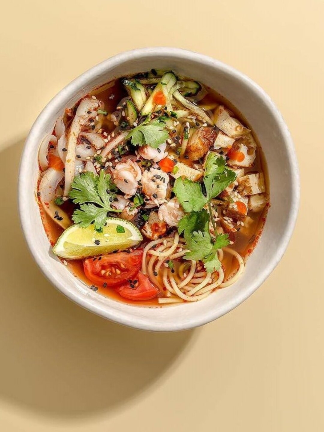 О холодных супах «Хокку» ходят легенды! Как минимум потому, что здесь подают не окрошку, а куксу — корейский суп с яичной лапшой, который готовят в трех вариациях: куксу том ям с креветками (470 рублей), куксу том ям с цыпленком (450 рублей) и куксу с говяжьей вырезкой (495 рублей). Кроме основного ингредиента в каждую порцию добавляют овощи, грибы вешенки или грибы муэр, омлет, лайм, кунжут и зелень.