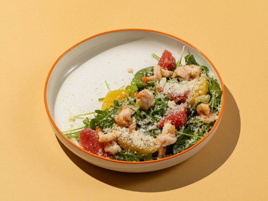 Новое, но уже нашумевшее заведение предлагает салат-иллюзию из микса свежей зелени, нежных креветок, пармезана, сочных долек цитрусов и фирменного соуса никкей – тот самый случай, когда еда способствует уменьшению талии.