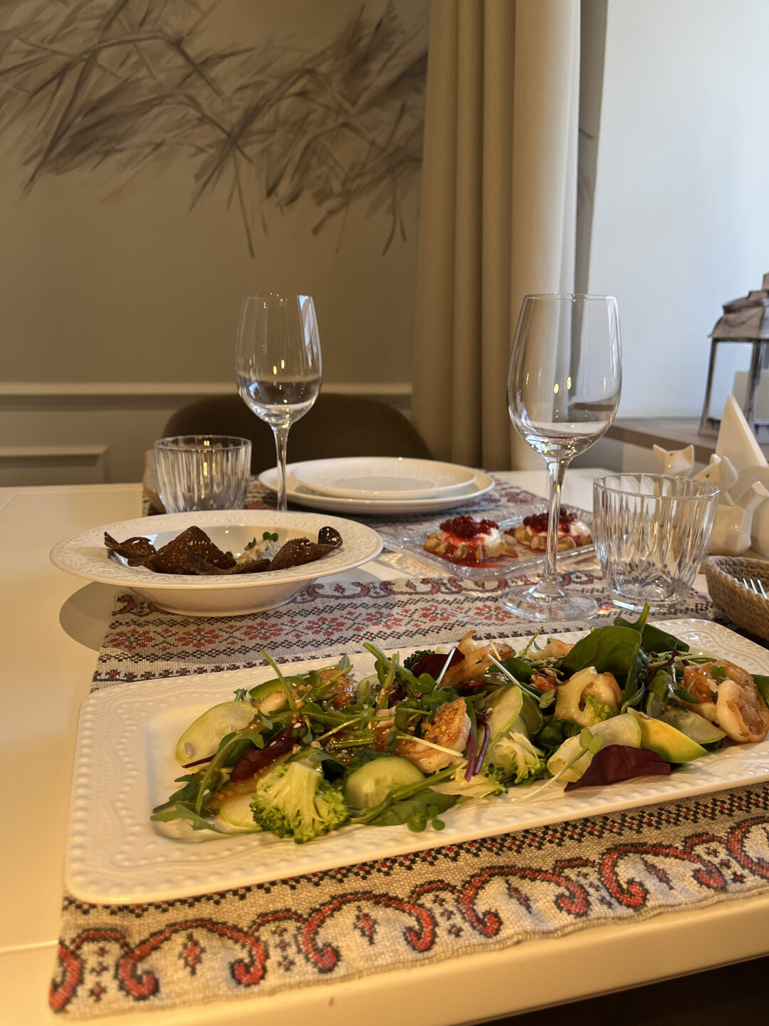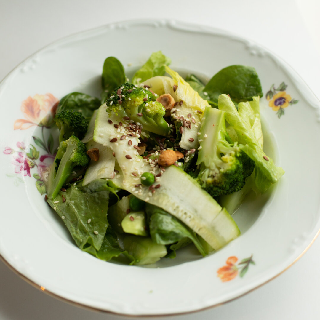 В уютном ресторане сочетаем приятное с полезным и пробуем легкость на вкус. Нежная креветка на воздушной подушке из свежей зелени, брокколи, слайсы цукини и огурца, а дополняет все это великолепие заправка на основе оливкового масла и ростки микрозелени.