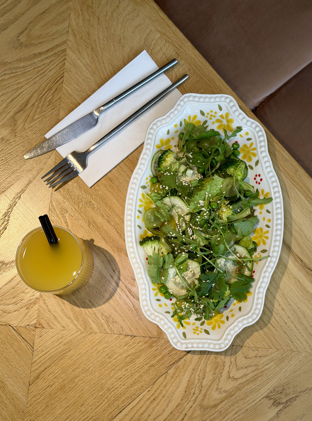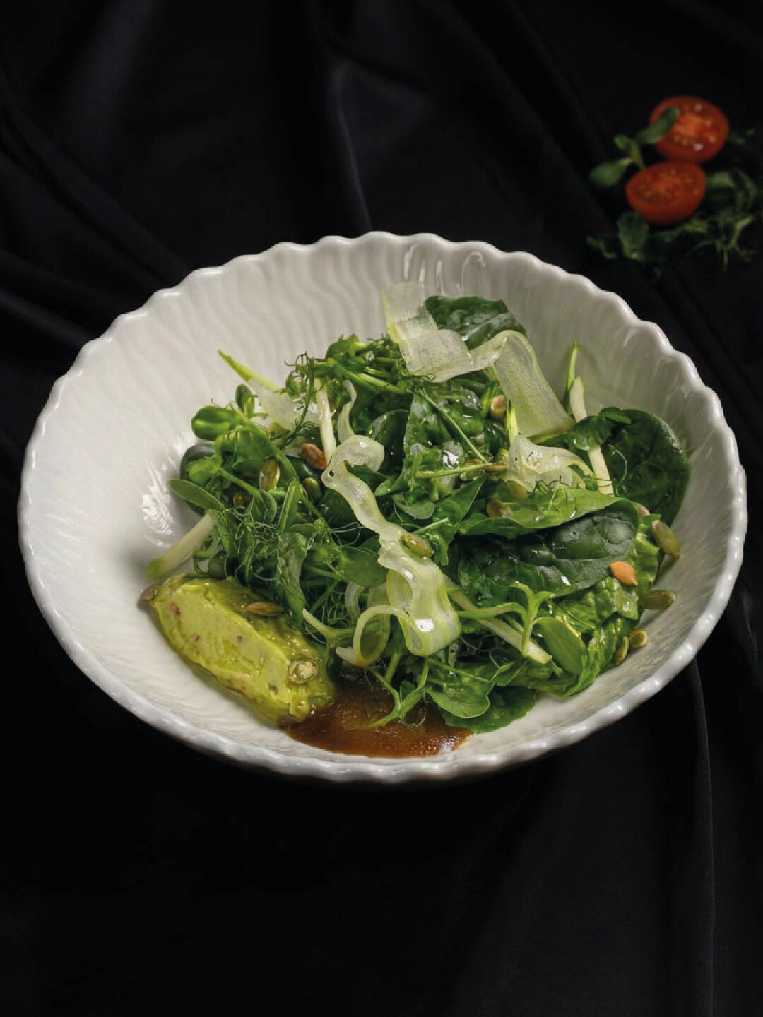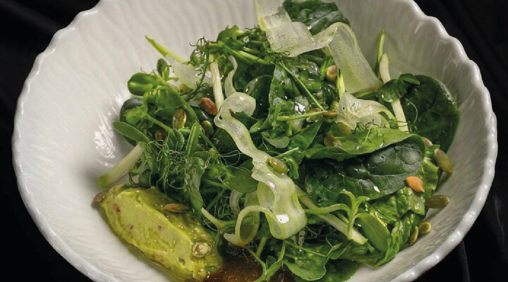 В ресторане, который не спит, заказываем салат с характером – свежий сельдерей, кабачок, романо, шпинат, ростки гороха, тыквенные семечки и горчичная заправка с гуакамоле – настоящее спасение от ночных гастрономических порывов.