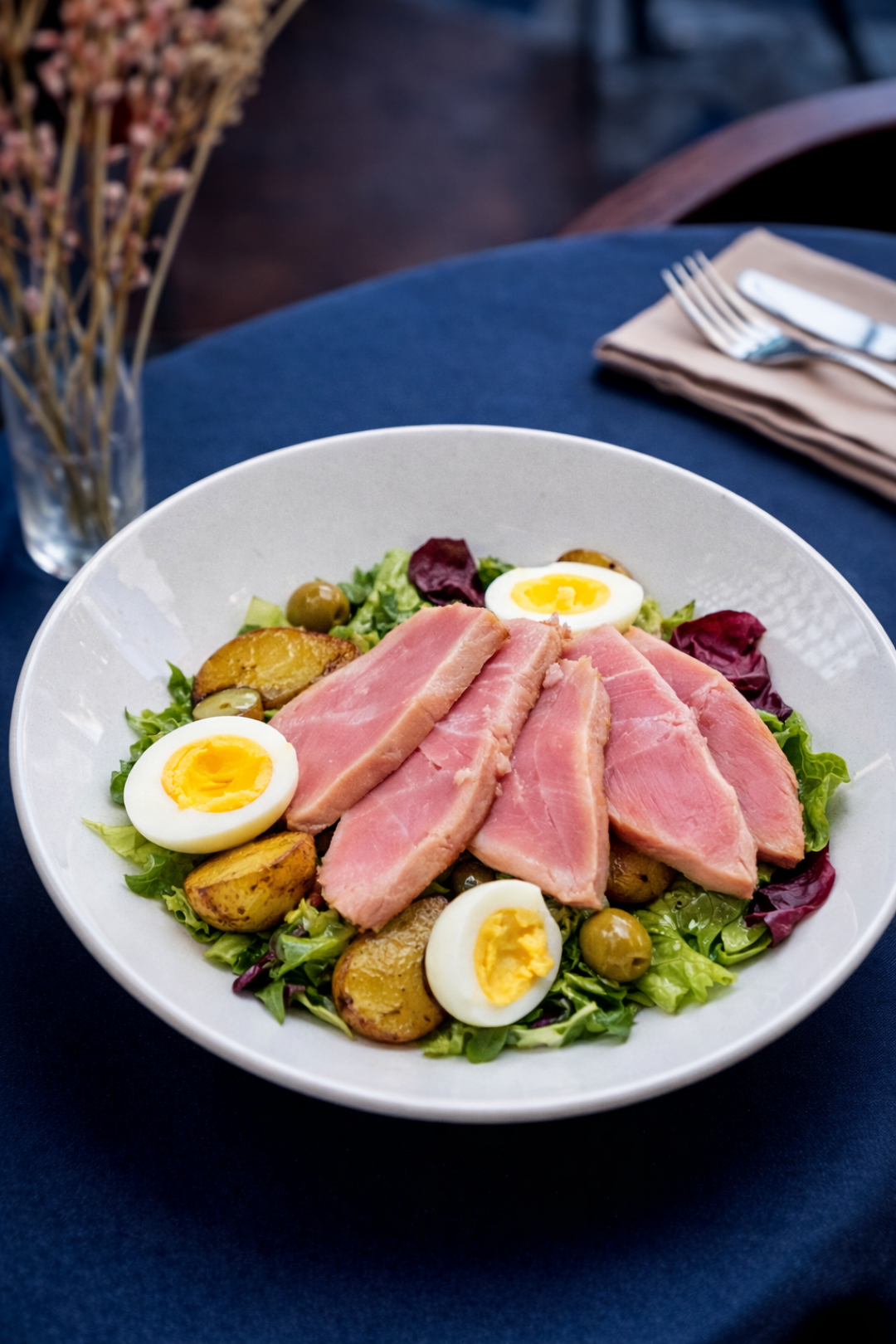 За классику французской кухни здесь отвечает салат «Нисуаз» – свежие томаты, огурец, жареный картофель, сочный тунец, оливки и перепелиные яйца – идеальный вариант для легкого и питательного обеда (и ужина!).