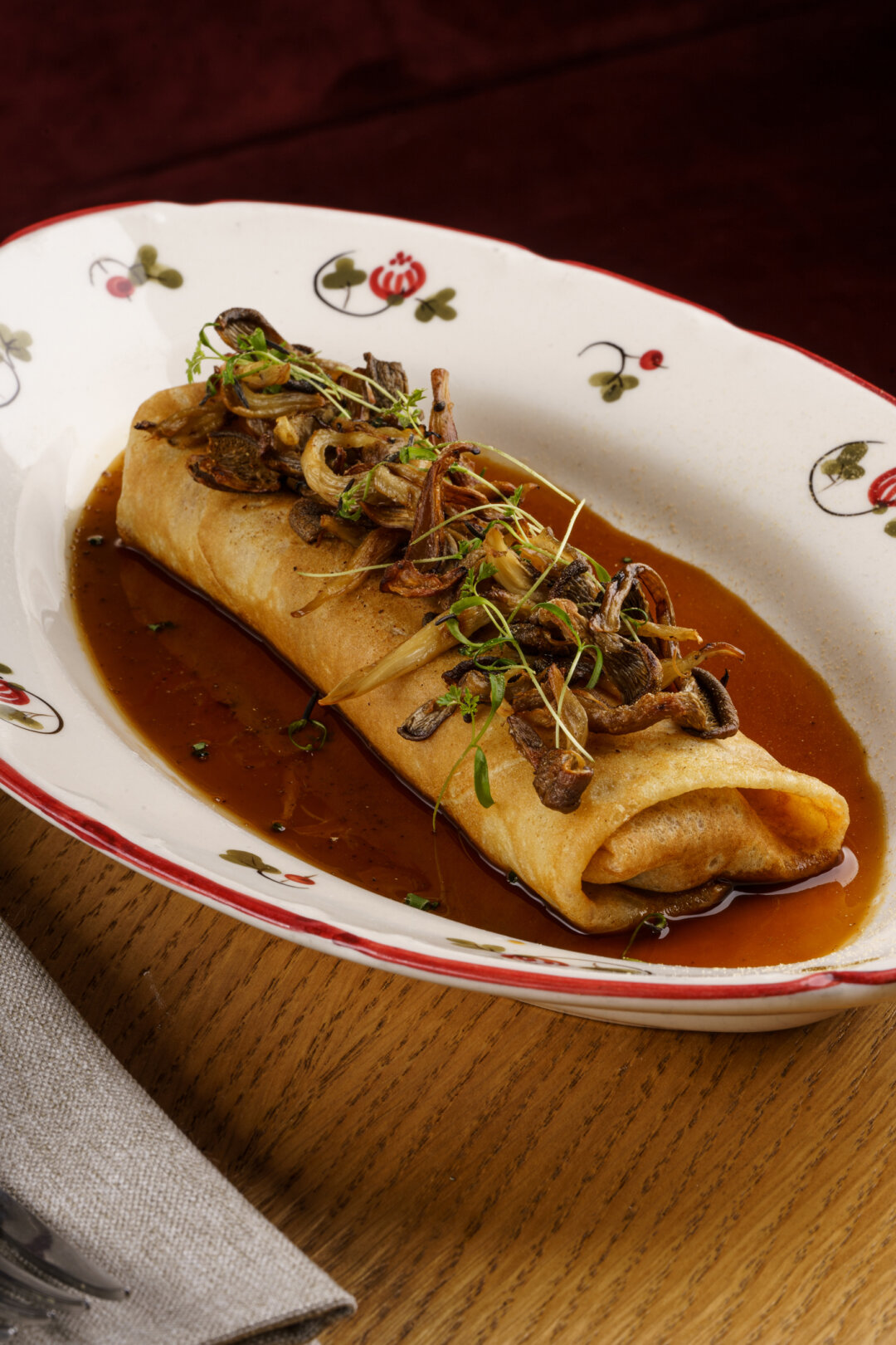 «Креп Сюзетт» с хурмой и фисташкой, блины с ростбифом, соусом тоннато, рукколой и вялеными томатами, варианты со сливочным кремом и лососем, мраморным фаршем и соусом жю, а также – блинный черемуховый торт с вишней – вот они – очевидные поводы заглянуть в гости к «Землянам» на этой неделе.