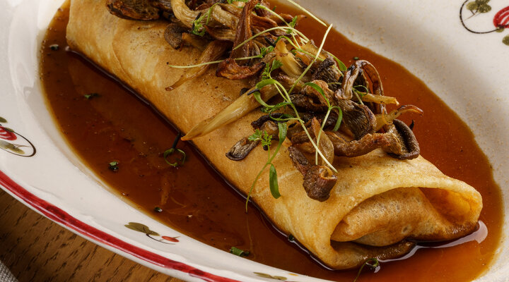 Среди пяти блинных новинок каждый (и мы в этом уверены!) найдет что-то на свой вкус. На выбор – блины с курицей и грибами, с уткой и томленой грушей, с говядиной в перечном соусе, с творогом и ягодами, а еще с вареньем.