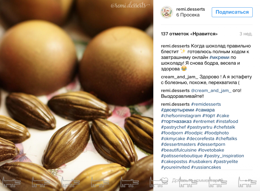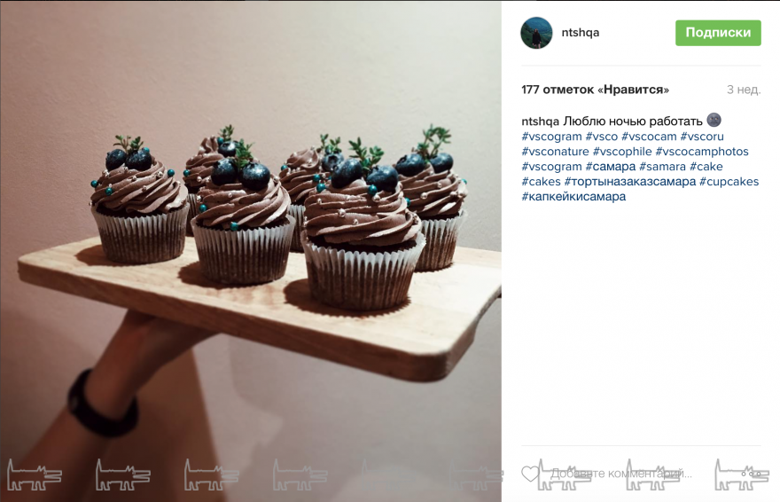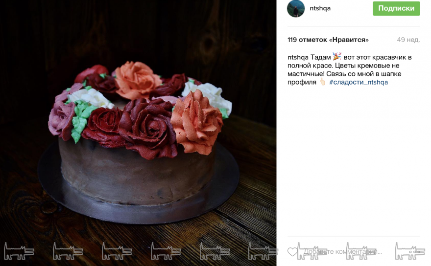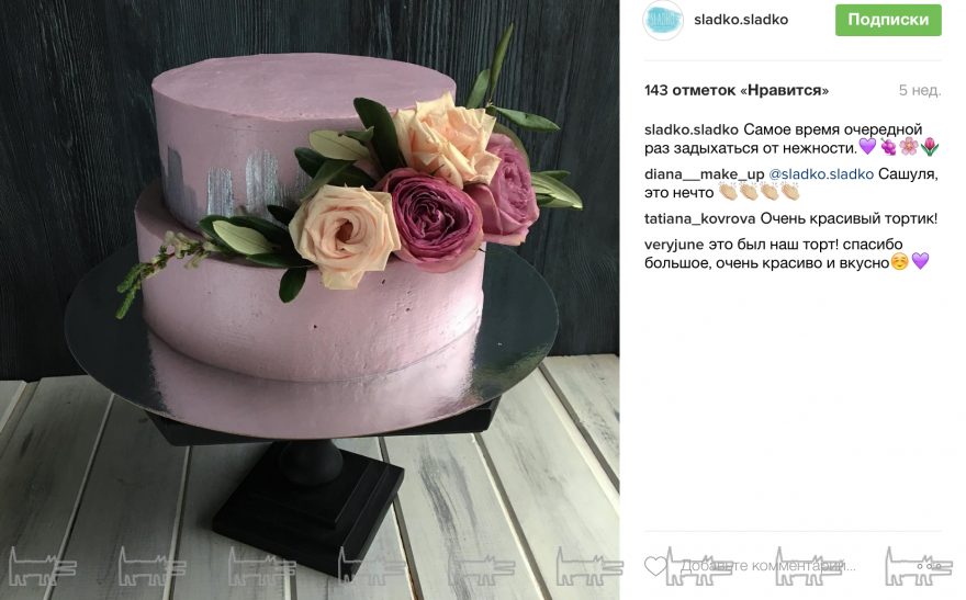Инстраграм, в котором видно, что кондитеры тоже живут, и их будни — не череда шоколадных и ванильных коржей. Юная девушка Наташа выкладывает картинки, выдержанные в едином стиле — благородный цвет темного дерева. Между ними радуют глаз качественные фотографии с путешествий, походов по кафе и просто интересных деталей. Соглашаемся с подписью в профиле: «приятные сладости для приятных людей».