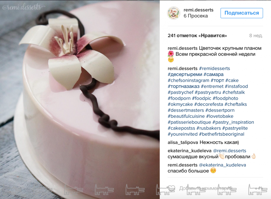 Мастерица Регина не заразилась модой на торты с многочисленными деталями — горы ягод, живые цветы, пестрые фигурки: все на одном десерте. Девушка - приверженец изысканных лакомств. Сладости всех оттенков, аккуратные украшения, фотографии из путешествий — залог интересного и успешного инстаграма.