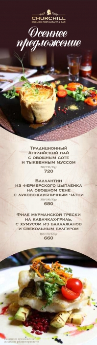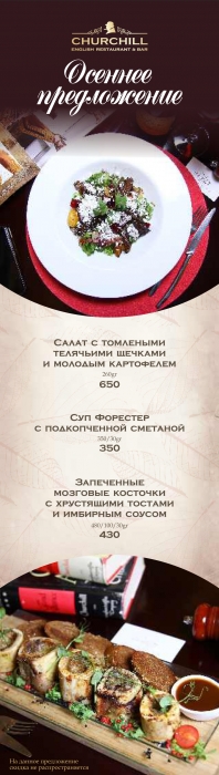 Несколько осенних предложений подготовили шеф-солисты кулинарной классики элегантного английского ресторана ЧЕРЧИЛЛЬ. Осеннее меню предлагает на закуску: салат с томлеными телячьими щечками и молодым картофелем; на первое: суп Форестер с подкопченной сметаной; а на горячее – ты себе такого представить не мог даже в самом вкусном сне – запеченные мозговые косточки с хрустящими тостами и имбирным соусом – блюдо не только полезное, но и невероятно вкусное. Изощренным гастрономическим гедонистам повара ресторана предлагают отведать также английский пай с овощным соте, баллантин из цыпленка и филе мурманской трески. Искать повод, чтобы отправиться в ЧЕРЧИЛЛЬ, долго не придется – 23 ноября день рождения ресторана. Приедет легендарная группа Arabesque. Уже можно бронировать столик на сайте или по телефону +7 (846) 313-00-00.