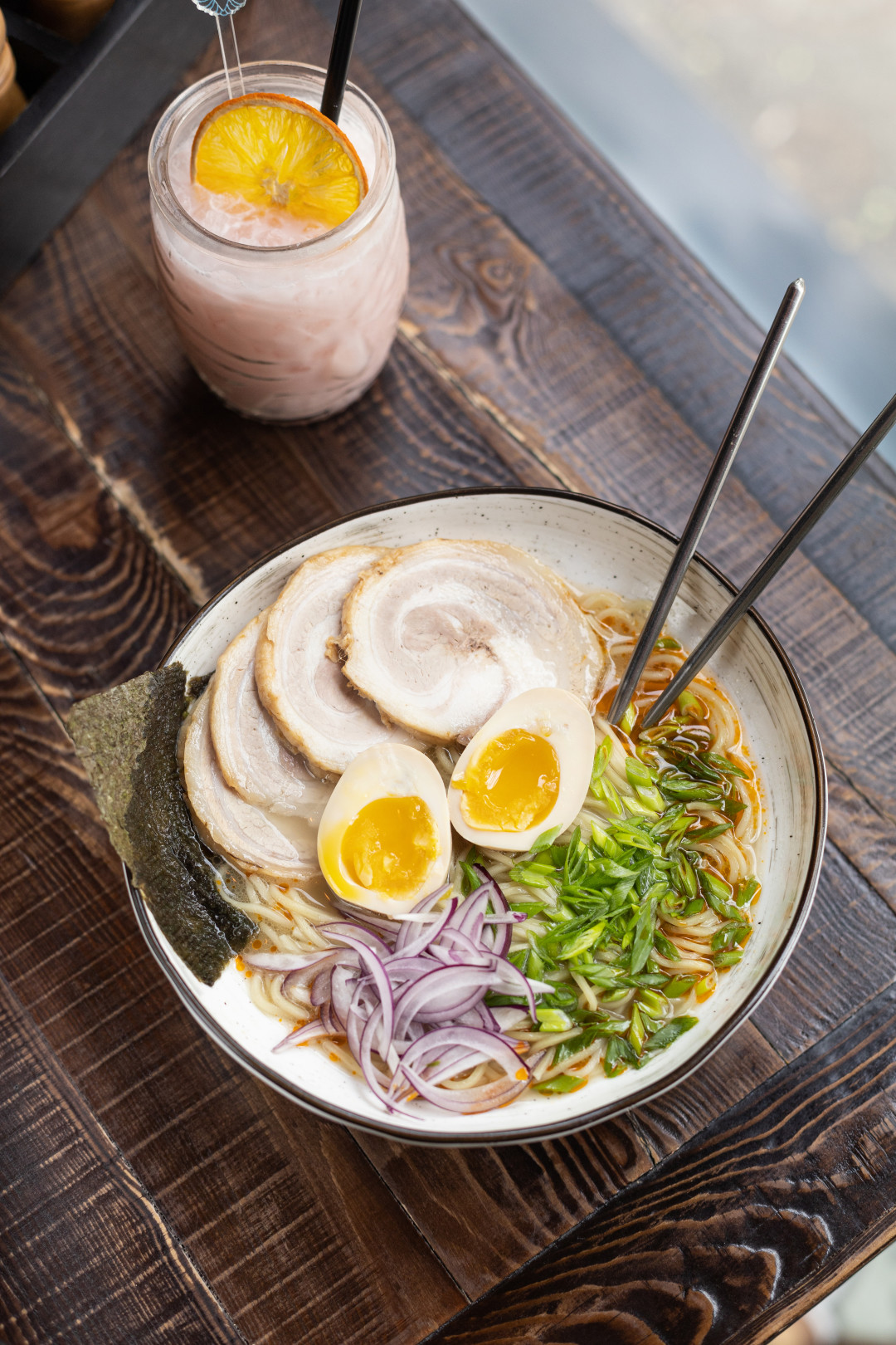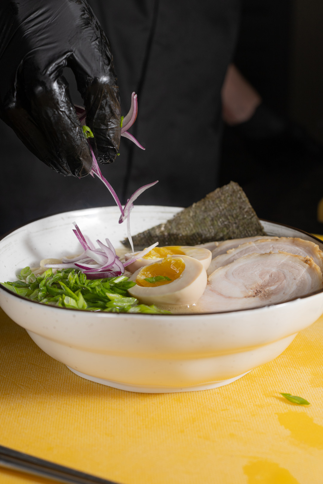 Отварите яичную лапшу. Для подачи в глубокую тарелку налейте бульон (350 мл.), добавьте лапшу и топпинги: слайсами выложите свинину, половинки яйца, зеленый и красный лук. Украсьте микрозеленью. По вкусу можете добавить любые овощи и мясо.