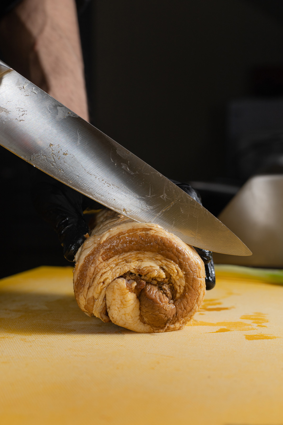 Тонкий пласт грудинки сверните рулетом, свяжите шпагатом и отварите в несоленой воде в течении 80 минут. Остывшее мясо маринуйте вместе с одной частью сушеных водорослей вакаме в смеси соевого и рыбного соусов (по одной части каждого) в течение суток в холодильнике.