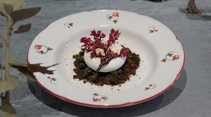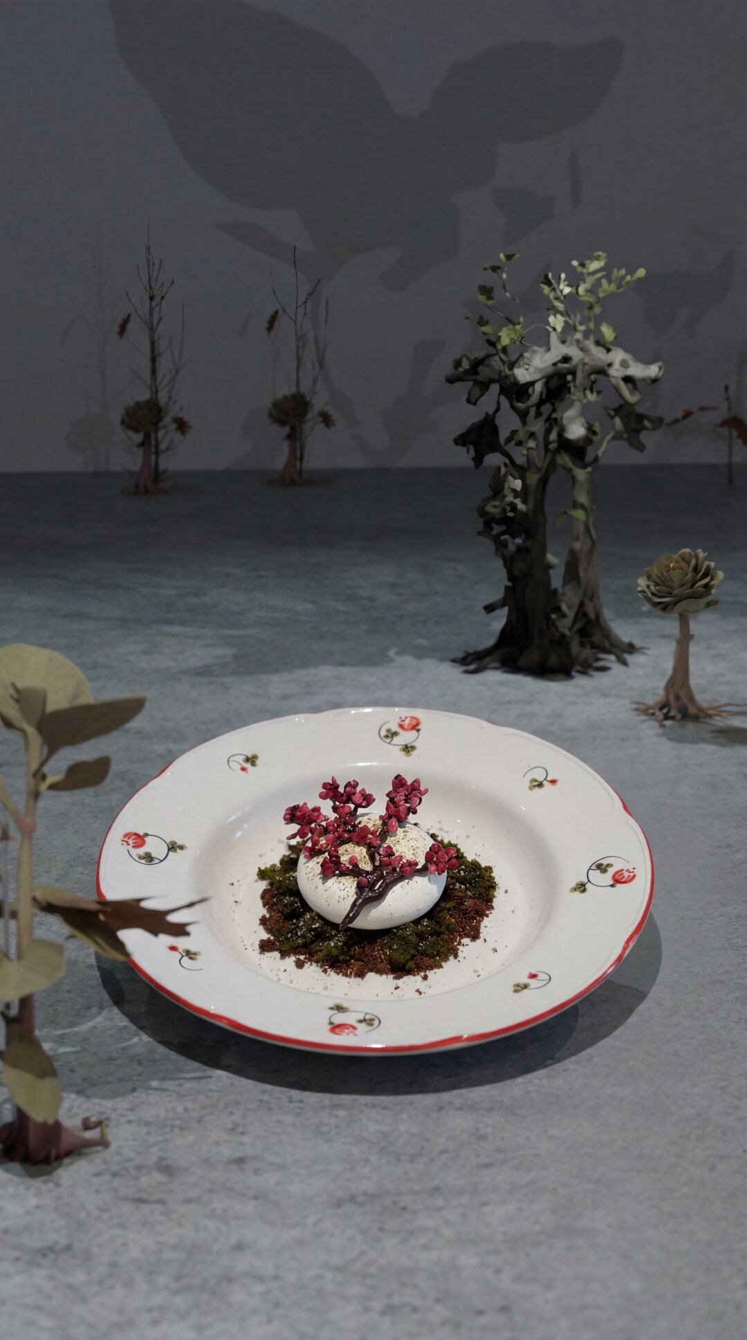 Для работы я выбрал инсталляцию Анны Комаровой «Хора». Сначала она показалась нам довольно сложной и даже мрачной, но если посмотреть на нее внимательнее, можно вспомнить, что в природе есть множество похожих состояний. Например, осень – момент, когда природа уже готовится к засыпанию, но именно перед этим происходит самое яркое буйство красок. Эта мысль привела меня к образу последнего цветения, которое также называют «лебединой песней» и «цветком сакуры» – редкого явления, когда жизнь как будто вспыхивает перед тишиной. В десерте мы попробовали передать это состояние: в нем есть и «земля», и легкий «снег», и ветка, которая неожиданно зацветает. Можно сказать, что у нас получился маленький гастрономический сюжет о способности видеть красоту в каждом моменте жизни. Нам это очень близко. Ну и, конечно, это еще один способ контакта с искусством: через вкус, текстуру и новые смыслы.