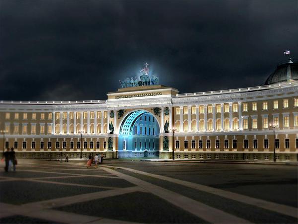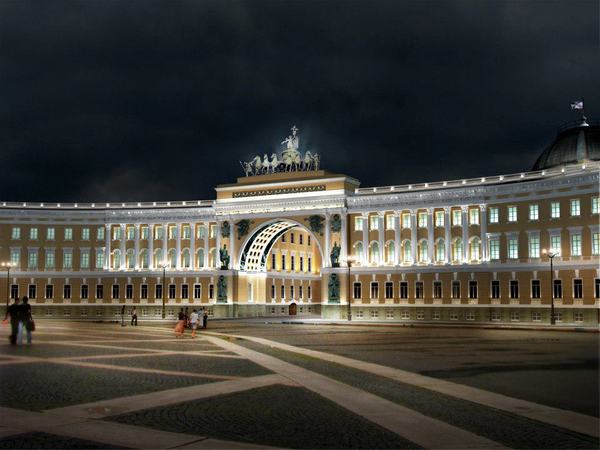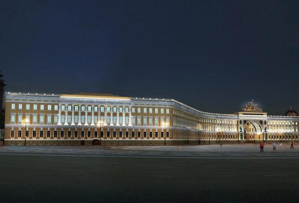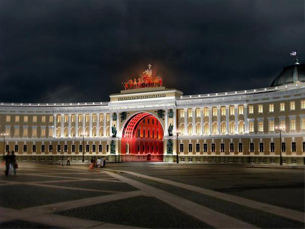 В Эрмитаже подвели итоги конкурса на концепцию подсветки Главного штаба. Победителем стал проект дизайнеров из Екатеринбурга Натальи Копцевой и Василия Тарасенко. Они предложили подсветить арку в синих и красных тонах. Идея схожа с идеей подсветки Лувра и Бранденбургских ворот: контрастным красным или синим цветами выделена внутренняя колоннада арки, фасад же при этом выглядит нейтрально. Особая подсветка у триумфальной колесницы: она создаёт эффект парения.