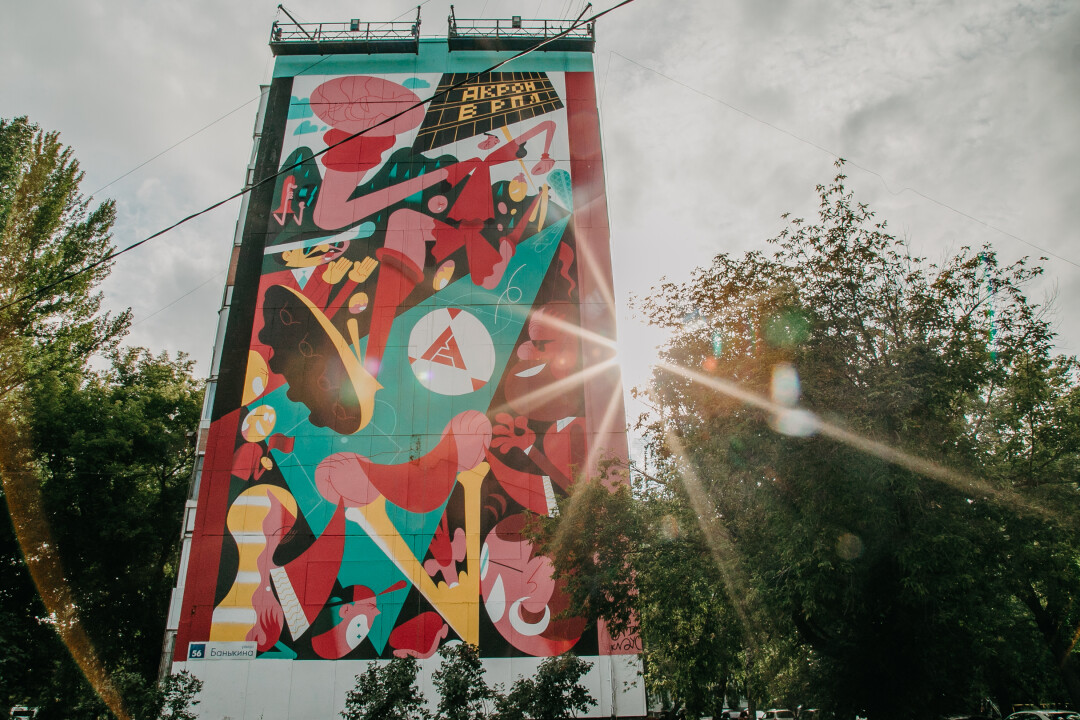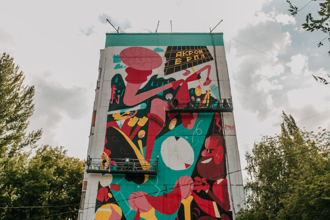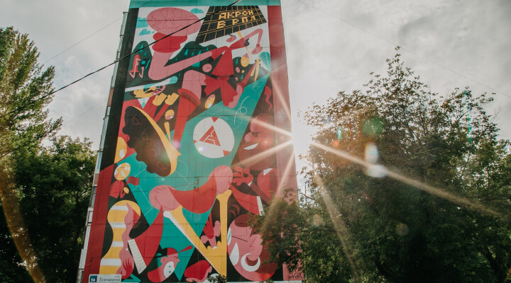 Команда футбольного клуба «Акрон» продолжает творить историю в реальном времени: после того, как клуб оформил выход в Российскую Премьер-Лигу, на стене одного из домов Тольятти появился огромный мурал, который должен сохранить это событие в истории города. Для создания этого яркого арт-объекта, собралась солидная арт-команда из трех известных в стране художников: Саша Афикс из Санкт-Петербурга и Сева Выводцев и Клаус из Самары.