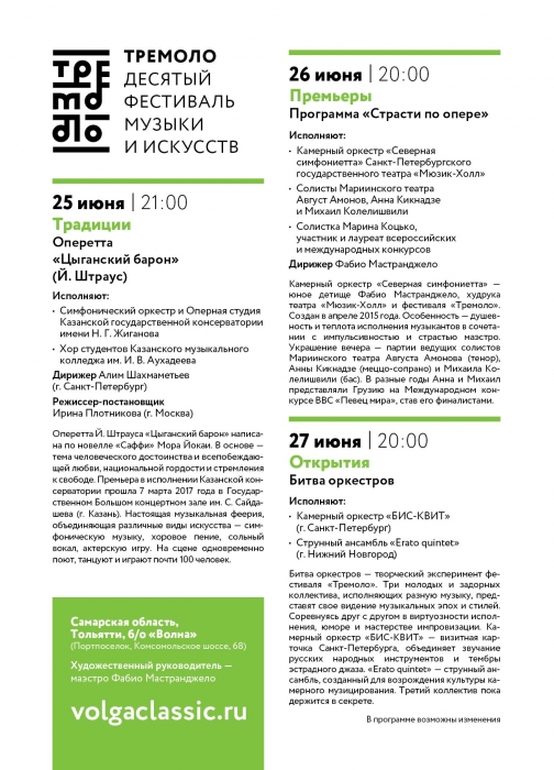 Напомним, «Тремоло», или «Классика над Волгой», проходит в Тольятти каждое лето, начиная с 2008 года, на берегу Волги, под открытым небом. Фестиваль стал «Лучшим проектом в области культуры» на рынке событийного туризма России про версии Национальной премии «RussianEventAwards» 2014 и 2015 года. Автор и директор фестиваля – Алексей Возилов. Художественный руководитель – Фабио Мастранджело. Генеральный информационный партнер – ТРК «Губерния», информационный партнер – радио «Август».