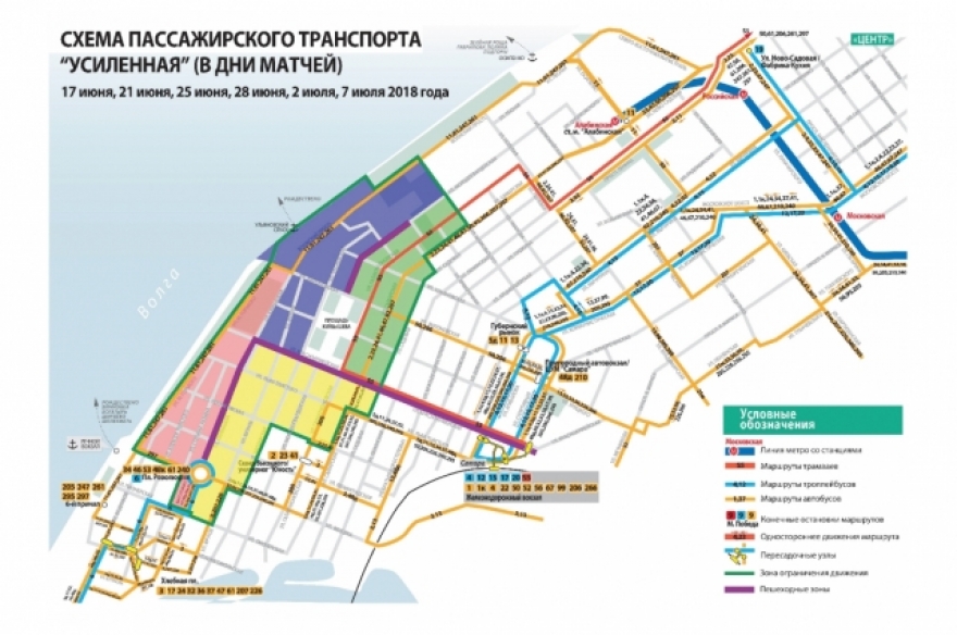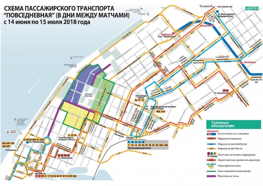 Усиленная схема будет работать в дни проведения матчей на стадионе «Самара Арена»: 17 июня, 21 июня, 25 июня, 28 июня, 2 июля, 7 июля с 00.00 до 02.00 следующего дня.