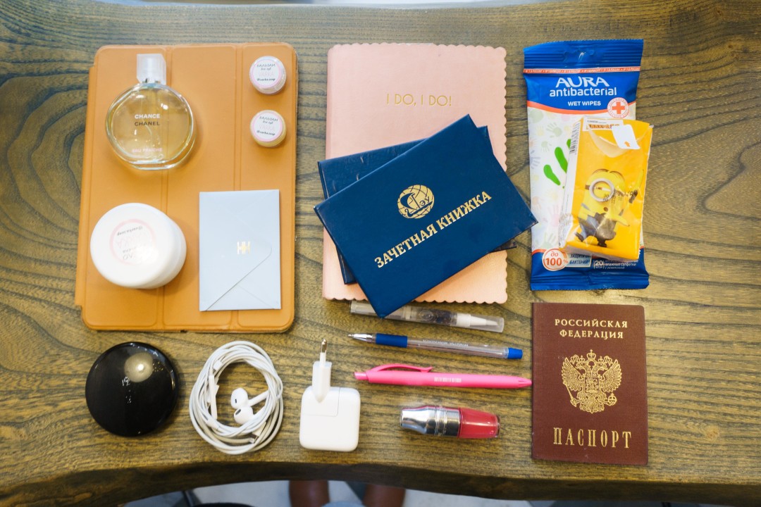 В сумке вся моя жизнь – очень много всего! Планшет, паспорт, водительские права, зачетки для очной и заочной сессии (Варвара получает два высших образования – прим.).