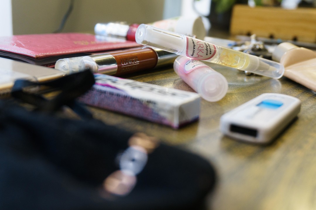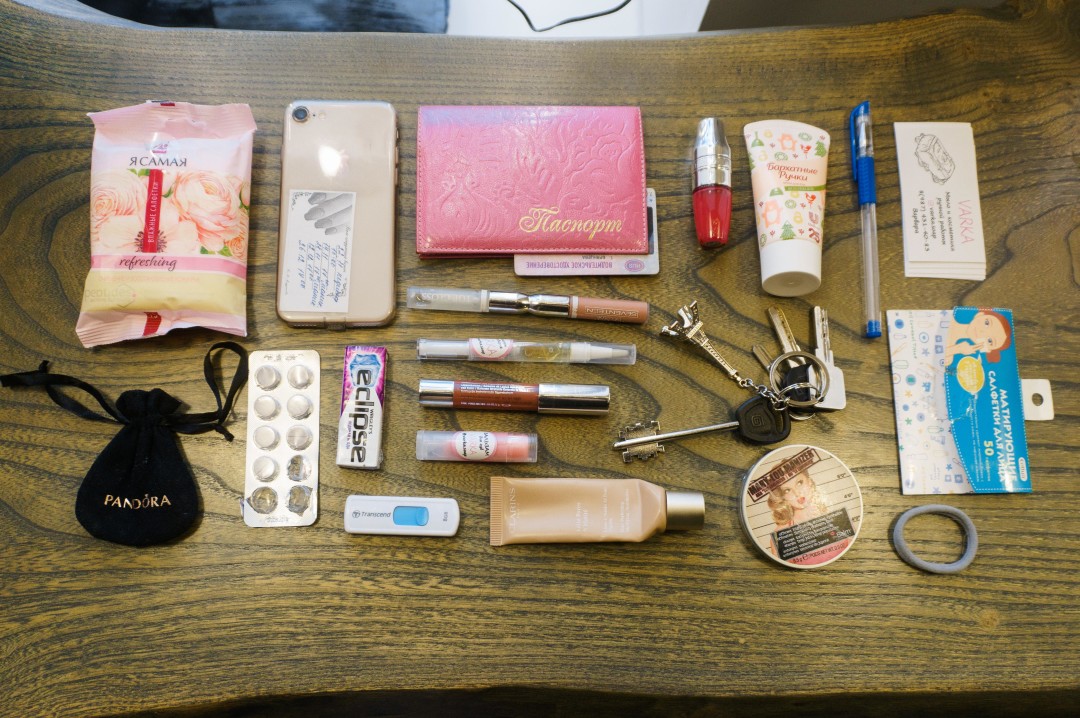 Свой крем для рук еще не создали, в процессе разработки, поэтому пока используем из магазина. Также с собой продукт для щек и для губ, хайлайтер, еще помада матовая и бальзам. Конечно, ключи. Эйфелеву башню привез дедушка мужа. Сменные сережки, жвачка и флешка – сейчас пишу диплом, заканчиваю второе высшее, поэтому без нее тоже никуда