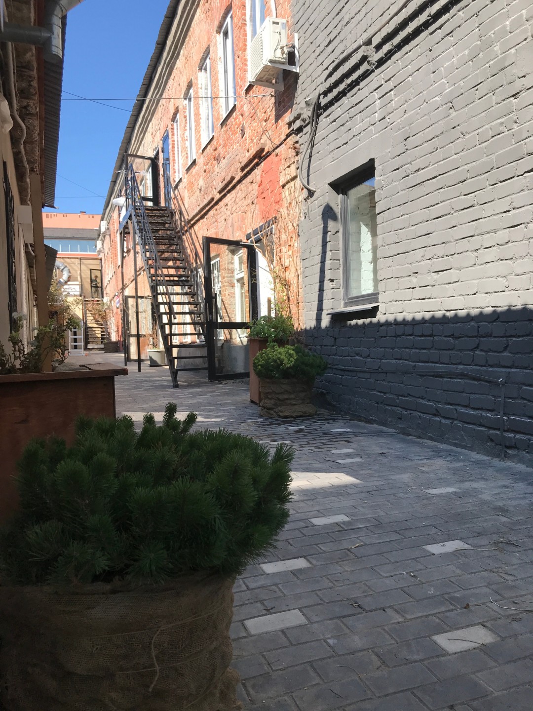 Первый проект - «8 Студий» стартовал в 2018 году и был готов в сентябре 2019-го. Здание бывшей фабрики «Модница» на улице Молодогвардейской, 86 было построено в конце XIX века и на момент покупки, как и многие объекты в историческом центре, представляло собой унылое зрелище. На виду, на первой линии лишь одна его часть, основное же пространство уходит от улицы в сторону двора. Эта особенность стала ключевой в определении будущей концепции объекта. Здание разделили на обособленные помещения, имеющие отдельные входы со двора, подразумевая, что посетители, перемещаясь снаружи, могут зайти в любую из студий за услугой, товаром или на мастер-классы, а может просто задержаться на территории уютного двора и провести время за чашкой кофе. Здесь можно отдохнуть, сфотографироваться и даже оказаться на концерте.