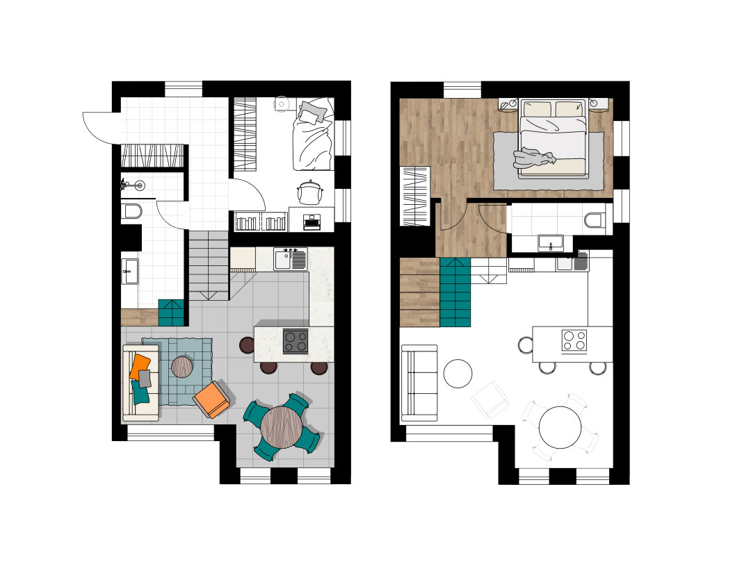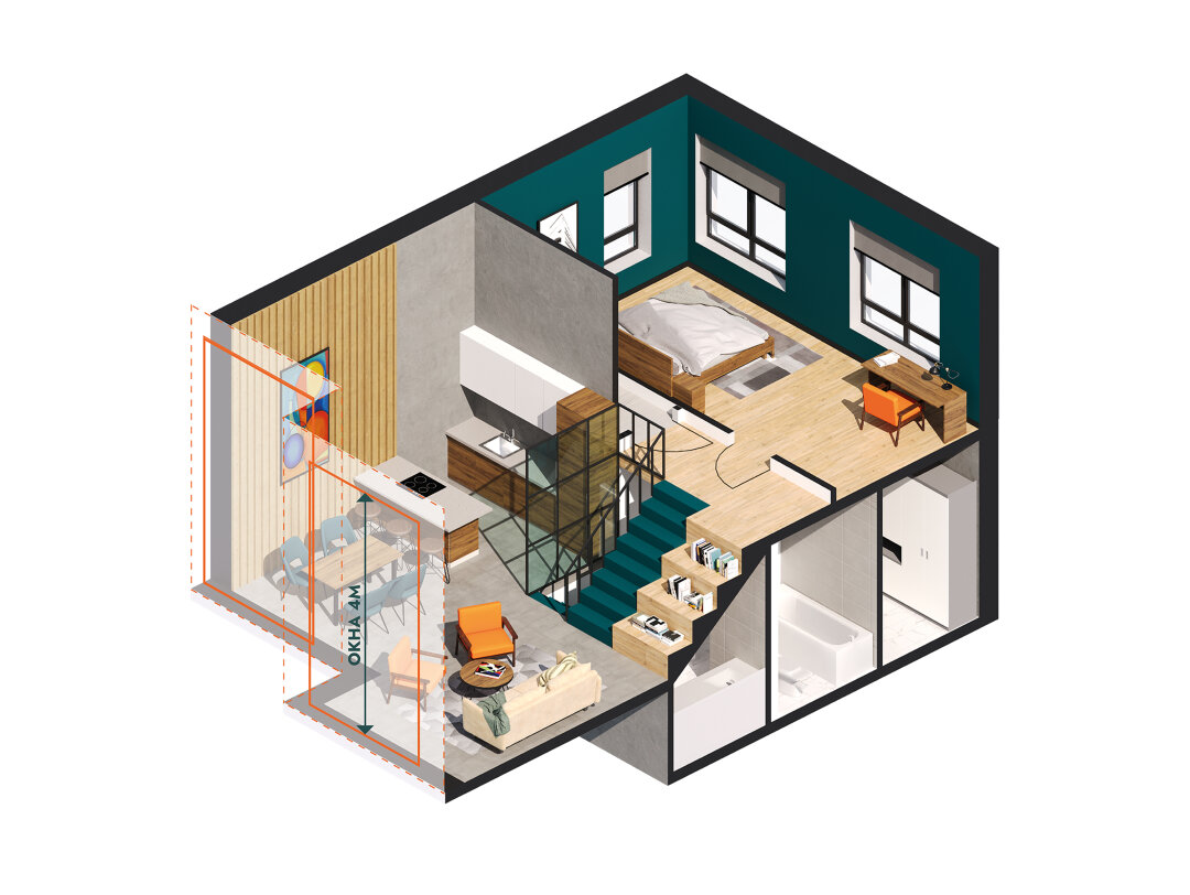 Квартира подойдет всем ценителям не типовых решений и поклонникам тихой роскоши. Высота потолков – в кухне-гостиной 4,65 метров! – и размер окна – более четырех метров – превращают ее в мечту индивидуалиста и любителя вау-эффектов! Чтобы отдохнуть от оживленных посиделок, можно подняться на следующий – в буквальном смысле! – уровень, а уютная мастер-спальня расположилась на самом верху.