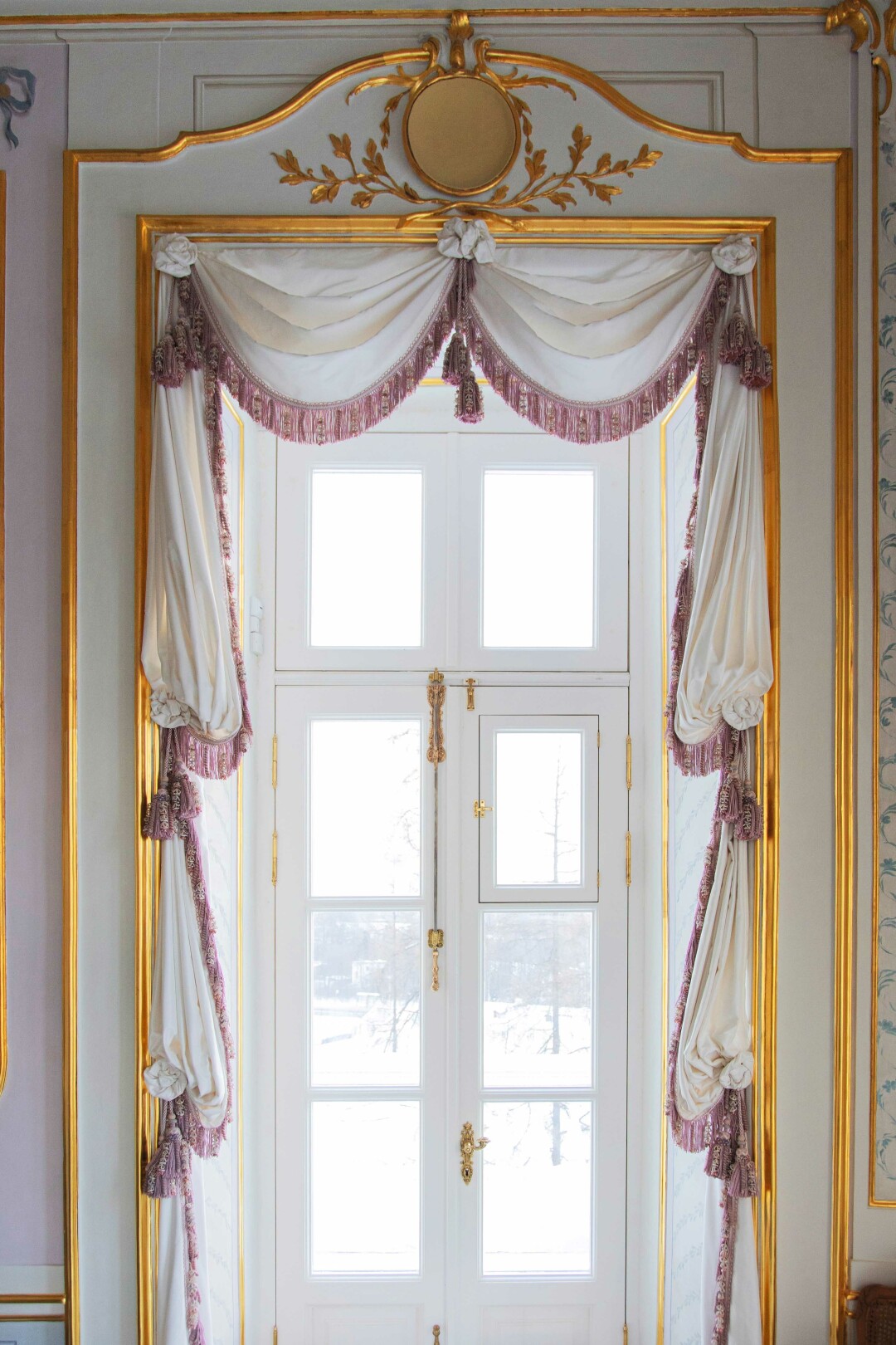 Шторы на окнах-дверях для выхода на террасу родом из XXI века. Но шили их вручную по гравюрам XVIII столетия. То же самое с бахромой, шнурами и кистями — они полностью повторяют специально приобретенные в качестве примера детали декора того периода.