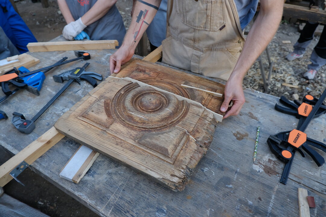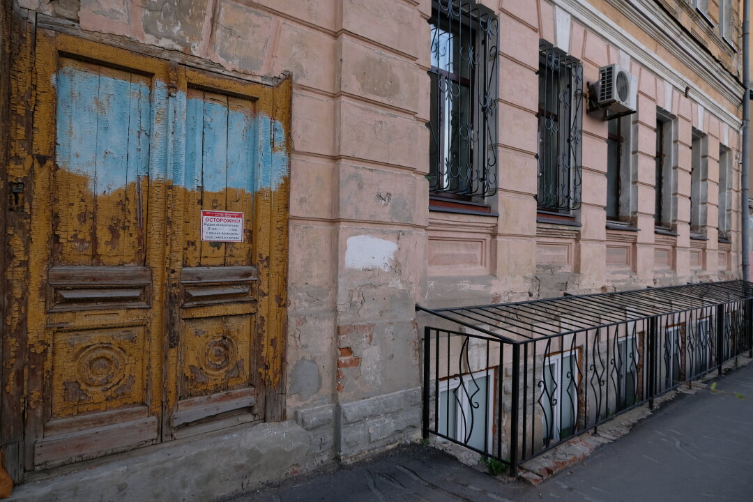 Это первый деревянный объект в нашем портфолио, поэтому делаем мы его не спеша. В прошлом году мы разобрали дверь и сняли с нее десяток слоев старой краски. Особенно непросто было с самым первым – на основе масла. Одна дверь была сделана во время реставрационного кампуса «ТСФ», на котором собралось около десятка опытных волонтеров из разных российских городов. Под присмотром реставраторов из Москвы мы разбирали двери на части, снимали старую краску, заделывали выбоины и восполняли утраты. Мы стараемся по максимуму сохранить оригинальные части дверей, но что-то было утрачено или превратилось почти в труху. Поэтому самарский плотник Сергей Пимахин изготовил для нас недостающие детали, а наш реставратор Аня Толстова очистила накладку, которую мы тоже вернем на дверь. Также Андрей на «Авито» подобрал недостающие и подходящие по стилю ручки и замок – все дореволюционное. В этом году мы соберем дверь, покрасим ее в исторический красно-коричневый цвет и установим на место.
