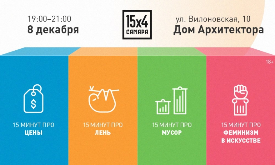 Движение 15x4 помогает делиться знаниями. Формат привычный – четыре лекции по 15 минут с обсуждениями.