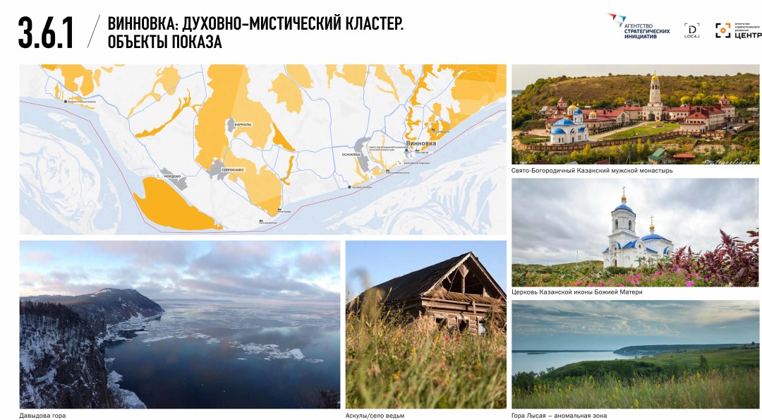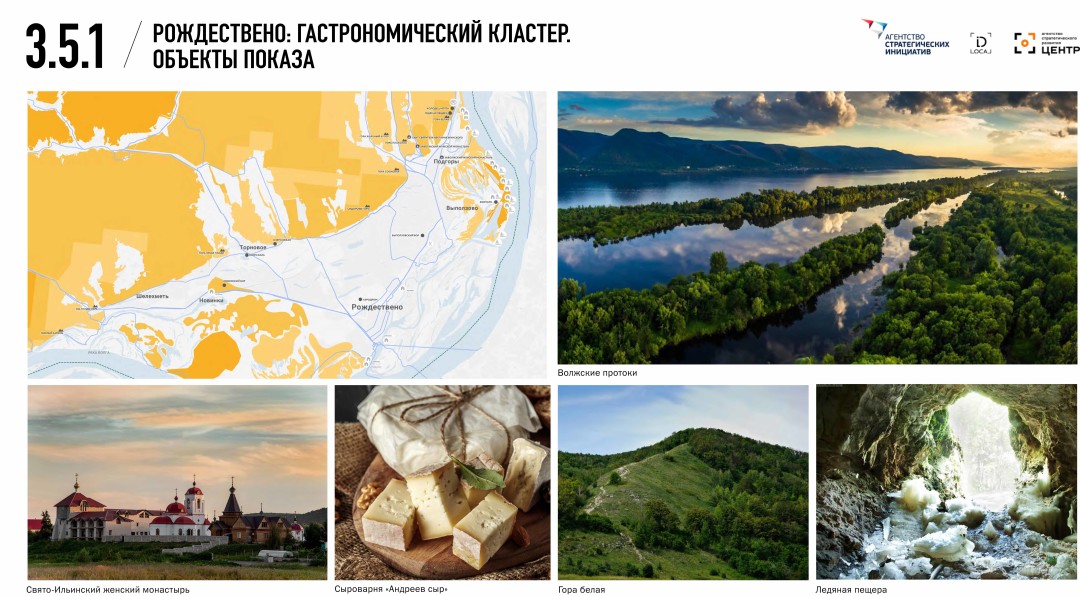 Мы выделили шесть кластеров на Самарской Луке, каждый из которых представляет собой определенную тематику, фактически усиливающую то, что там уже есть. Мы предусмотрели даже арт-кластер, где могли бы поработать художники с естественной средой. И яхт-клуб, поскольку нужен причал: обеспеченные люди с яхтами отрезаны от этой территории. Мы прорисовали смотровые площадки как архитектурные объекты, чтобы повышать популярность места: людям должно хотеться там фотографироваться. В Рождествено мы предположили наличие кластера, связанного с едой, ремеслами. Интерес этой работы состоял еще и в том, что максимальная антропогенная нагрузка на этой территории уже близка к нулю, то есть уже нельзя бездумно увеличивать количество приезжающих сюда туристов.