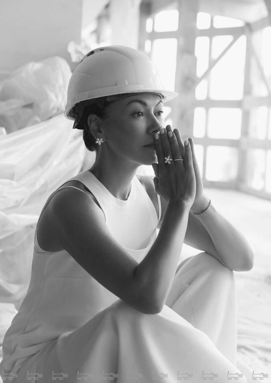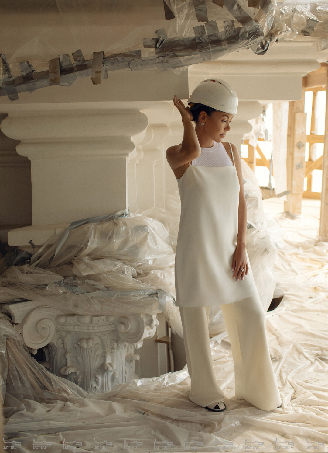 Анна сфотографирована на колокольне Никольского морского собора, построенной архитектором Саввой Чевакинским (елизаветинское барокко!). Прямо сейчас здесь проходит реставрация по программе КГИОП — это редкая возможность подняться на десять этажей вверх и увидеть вблизи коринфские капители и скульптурных херувимов (в облаках и с сиянием!). На Анне: серьги и кольцо MERCURY из коллекции Flower, платье-комбинация, трикотажный топ, трикотажные брюки 12 STOREEZ,  обувь «ЭКОНИКА»