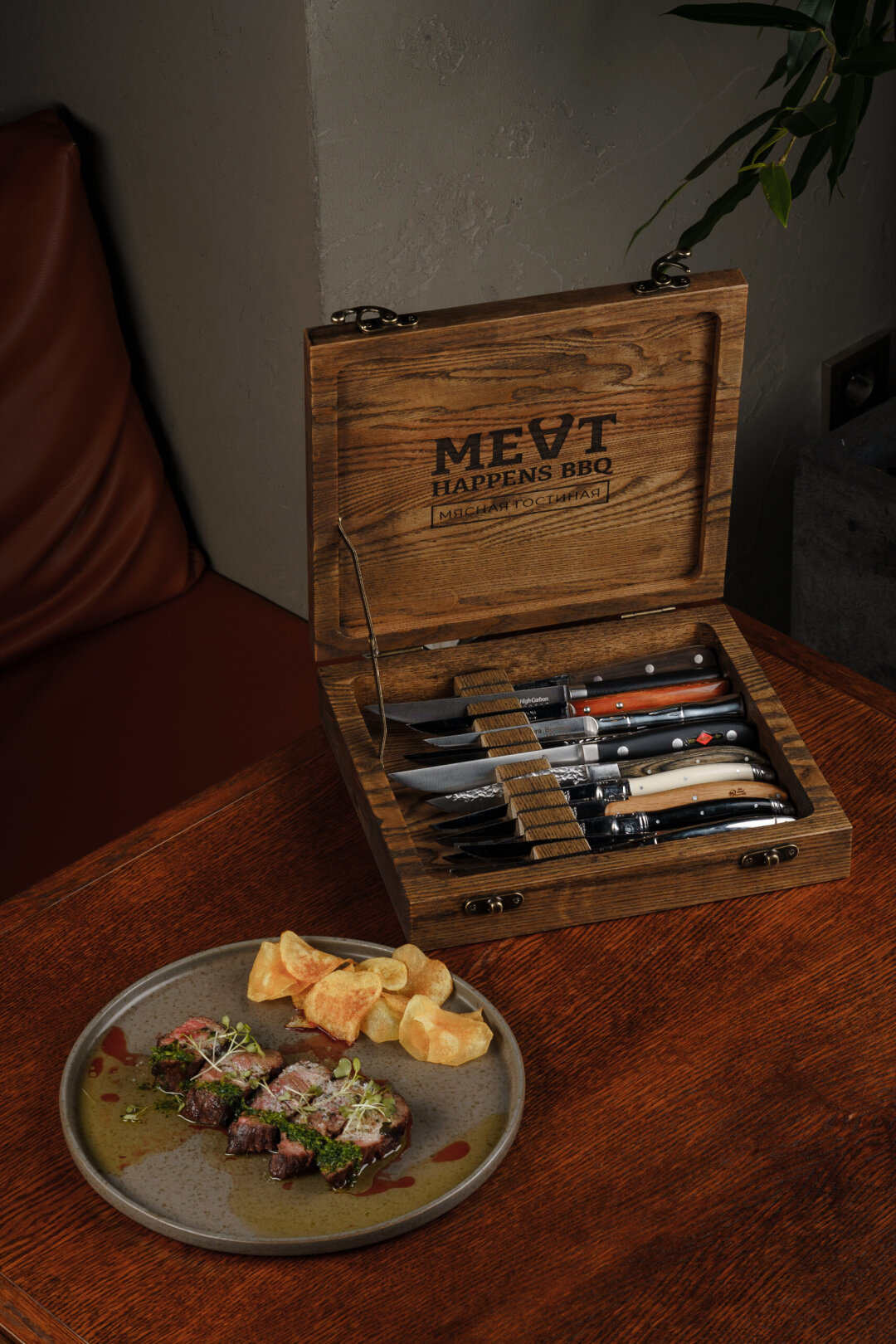 Первый нож ресторатор Артем Шишакин привез из дубайского стейк-хауса Nusr-et, и коллекция постоянно пополняется новыми экспонатами, которые привозят из путешествий члены команды мужской гостиной или дарят ее гости. В основе концепции коллекции Meat Happens BBQ лежит идея превратить знакомство со стейком в незабываемый опыт: сегодня каждому гостю предлагают выбрать «свой» нож из специального деревянного бокса, в котором хранятся двенадцать разных экземпляров, отличающихся лезвием и рукоятью. И это далеко не полная коллекция в абсолютном смысле! В разные периоды в сундуке могут появляться разные ножи: набор формируется в зависимости от конкретного сезона, гастрономической тематики, особенностей меню, ожидаемой загрузки и качества стали. Один из самых важных критериев – форма клинка и тип лезвия: важно, чтобы оно обеспечивало чистый и аккуратный срез, не разрушало структуру волокон мяса, сохраняя весь сок фирменного мяса.