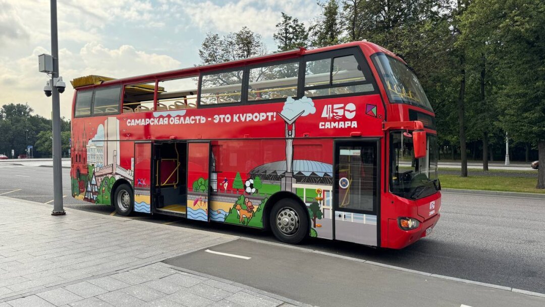 Да, это двухэтажный туристический автобус с достопримечательностями Самарской области. И сегодня он отправился в первый рейс по знаковым локациям Москвы, в том числе, останавливался и на Красной площади. Маршрут составил целых двадцать четыре километра: такие экскурсионные трипы будут проходить (!) тридцать дней подряд – с десяти утра до шести вечера.