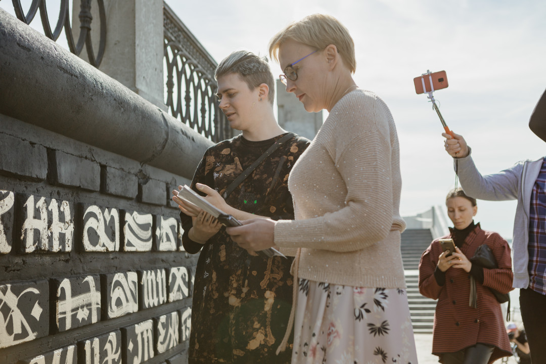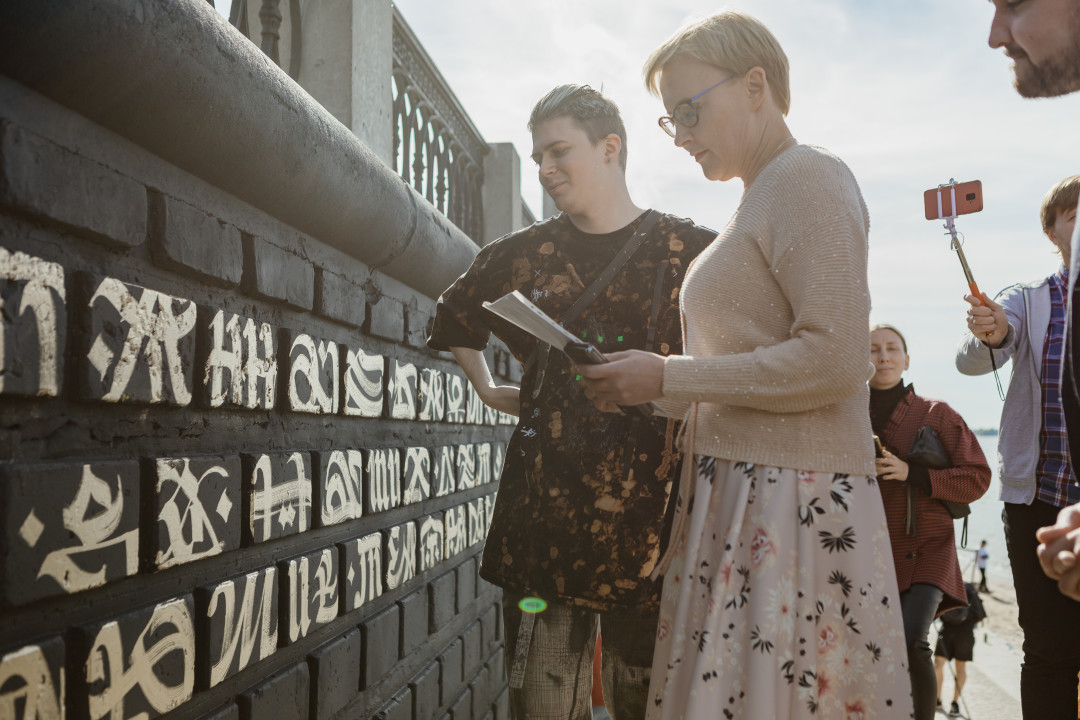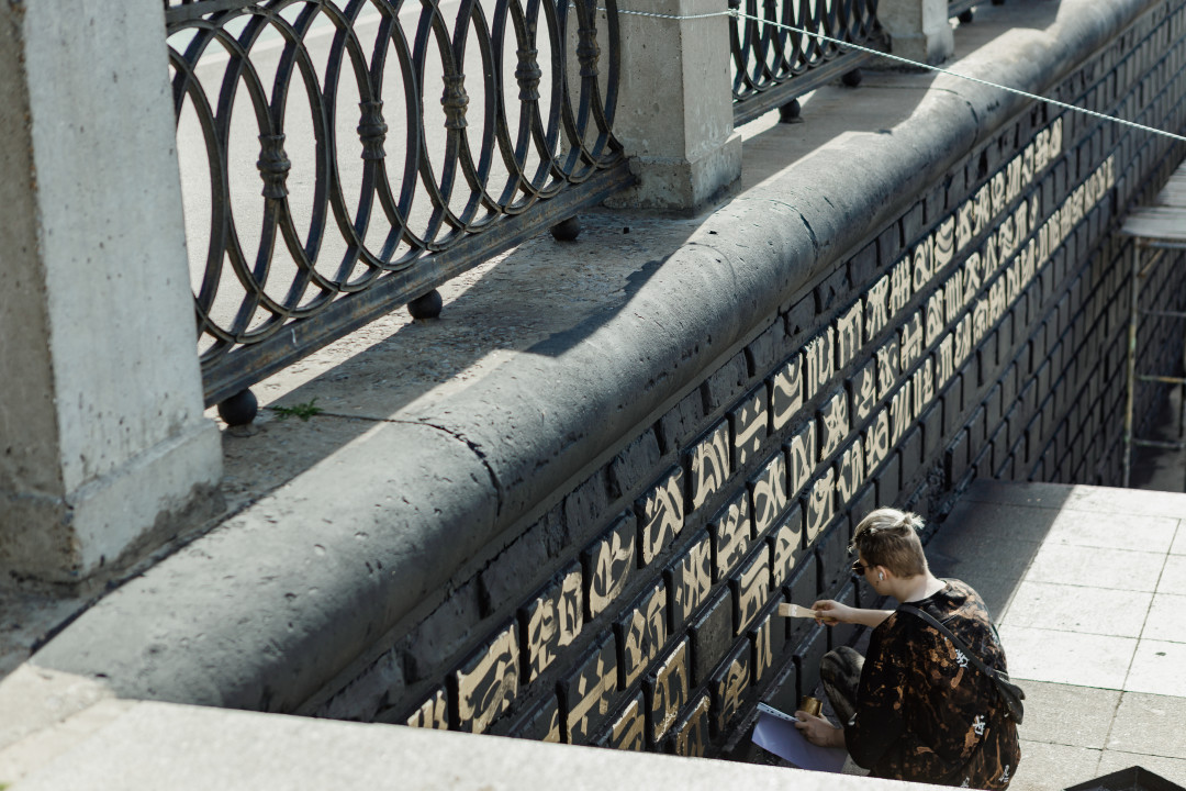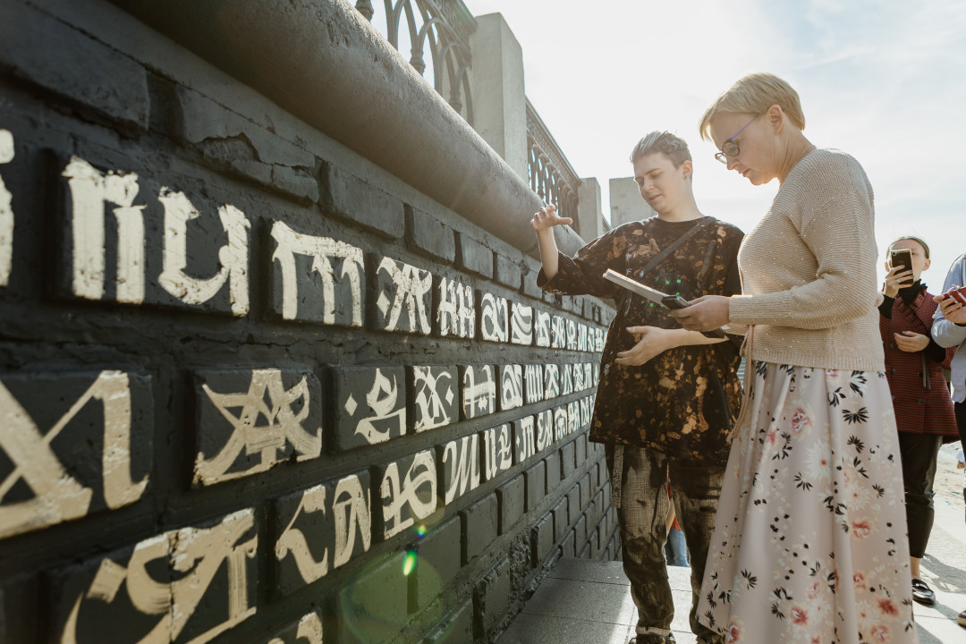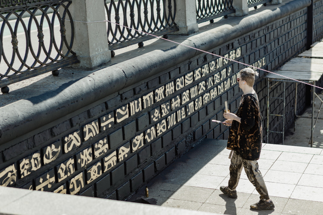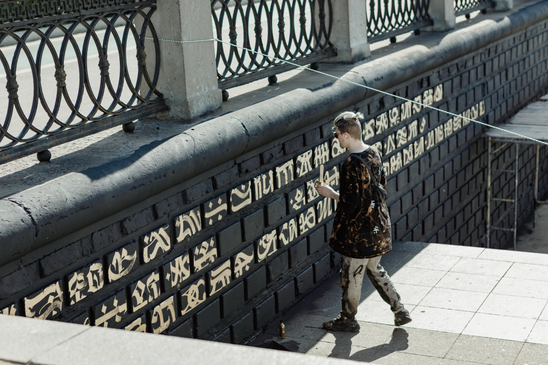Поэтому в данном случае я пишу текст на русском языке, но при этом интегрирую в этот текст очень большое количество графем из других культур, из других языков, показывая тем самым, что может произойти с нашей письменностью», – рассказывает о своей работе Покрас Лампас (цитата из аккаунта проекта SAMARA GROUND 2020 в Инстаграме).