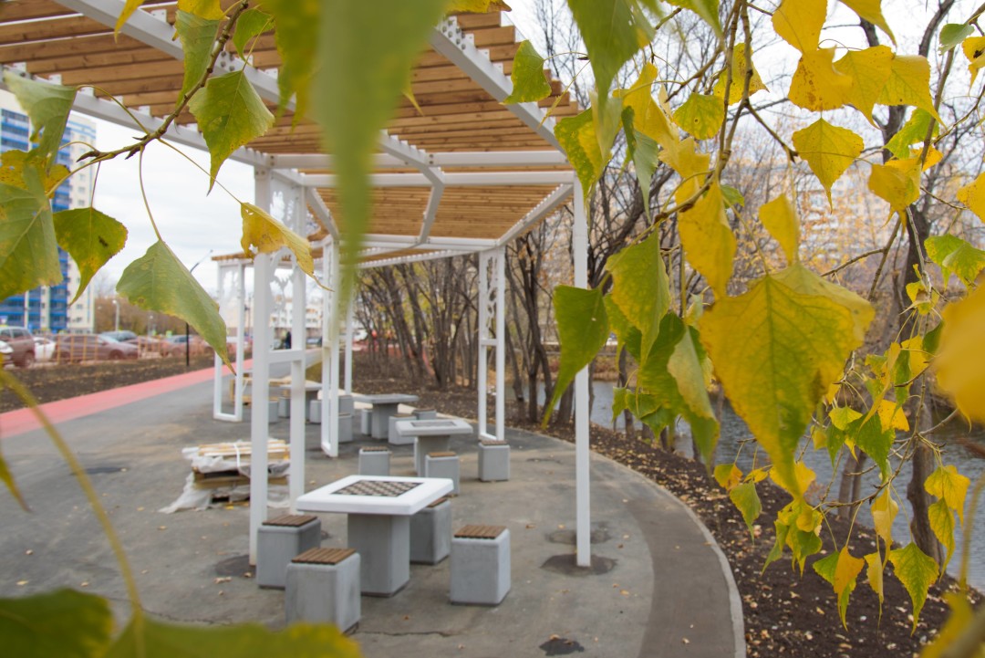 Что это? Детально продуманный сквер в жилом комплексе рядом со школой и детским садом. Все поверхности и формы зоны отдыха здесь сделаны так, чтобы максимально приблизить людей к природным мотивам, дать отдых взгляду. Для озеленения ландшафтные дизайнеры принципиально использовали растения, которые растут в нашей полосе, требуют минимального ухода и отлично приспособлены к жизни в городских условиях. А пока молодые растения набирают силу, частично их функции берут на себя треугольные перголы.
