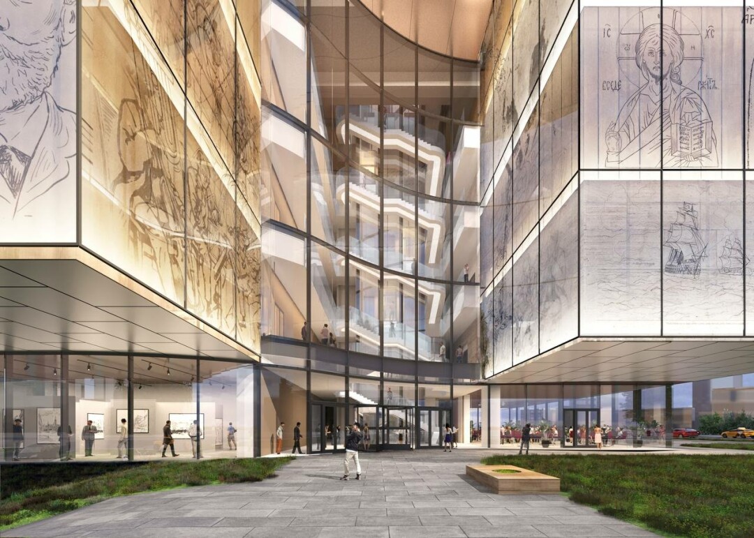 «В соответствии с функциональной программой объем здания получил выраженную по вертикали трехчастную структуру. Во-первых, доступная для публики музейная часть выделена с помощью более нарядных, художественно оформленных фасадов, тогда как офисный блок представляет собой светопрозрачный объем. На уровне первых пяти этажей, где экспозиционные залы соседствуют с габаритным пространством концертного зала, строение увеличивает свою площадь за счет симметричных консольных выносов», — также добавил Кузнецов.