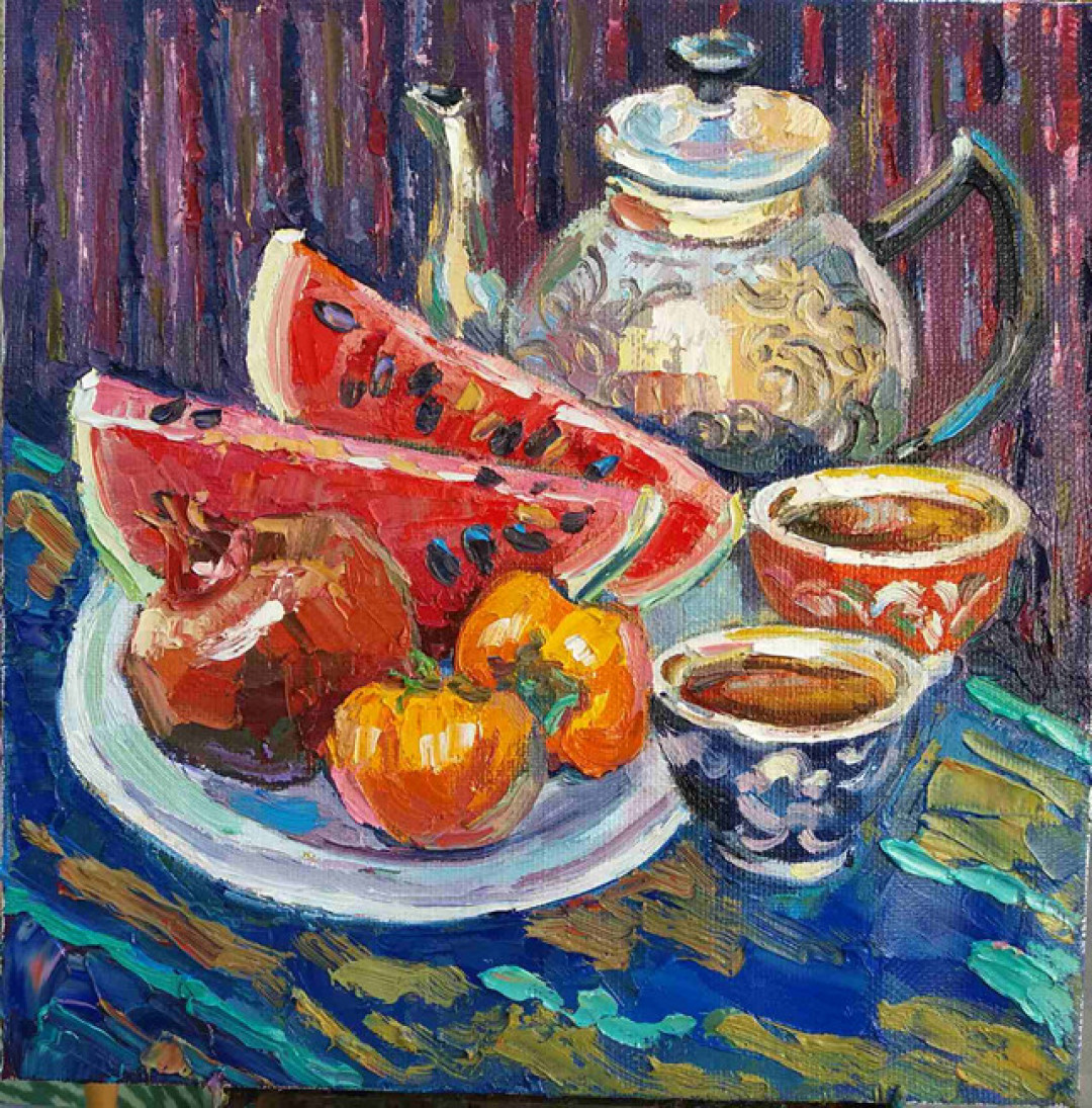 Участники научатся писать натюрморт по композиции из фруктов с блюдом на фоне восточных тканей, которые Анна привезла с пленэра в Бухаре.