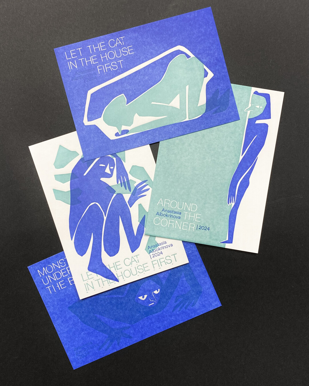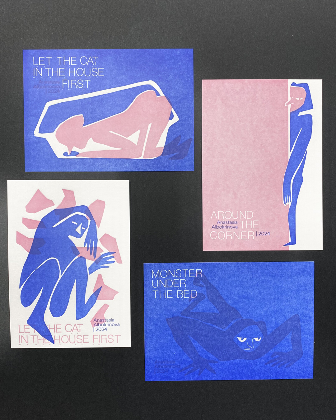 «Работу над проектом я начала весной этого года, когда приехала в резиденцию Footnote center в Белграде, в которой художники занимаются скрещиванием изображений и текстов. Проект родился во время, когда понятие «дом» для многих теряет четкие контуры и эмоциональный заряд, становясь местом, где для тебя как будто нет места. «Руководство по Неправильному Размещению» – это серия практик в пространстве для ваших тел. В небольшом зине со страницами для самостоятельного заполнения я описала несколько простых и смешных упражнений, выполняя которые можно обрести со своим «домом» более прочную связь. Например, «Пустите кошку первой в дом» – игровой осмотр квартиры с позиции кошки, «Скелет в шкафу» и «Монстр под кроватью» – практики прятания и глубоких размышлений, а «За углом» - квест по пересечению квартиры под невидимым взглядом. Но у проекта есть и визуальная часть – это зарисовки, которые я сделала во время собственных практик, запечатлев себя в самых странных позах. Потом я превратила их в коллажи, а коллажи – в плакаты и открытки. Мне было интересно попробовать ручные техники печати, поэтому плакаты я напечатала методом шелкографии в студии Matriarsija в Белграде, а открытки – уже в Самаре, методом высокой печати в музее-студии Letterhaus. Эти открытки, можно найти в лавке галереи Виктория».