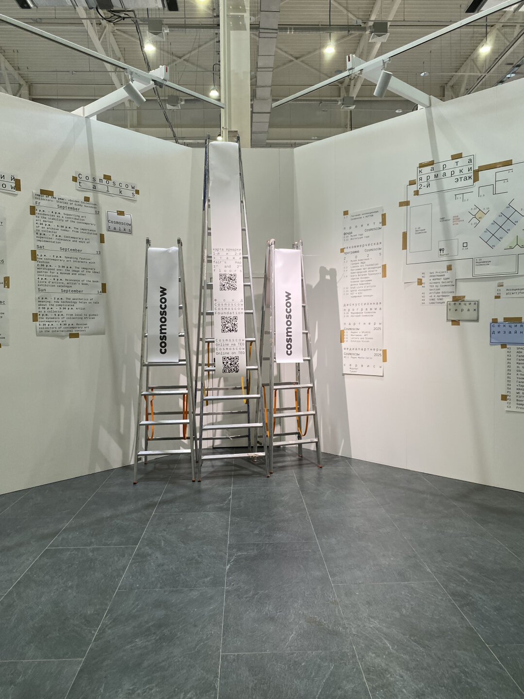 Стиль Cosmoscow этого года – техническая, временная навигация. Обычно ее встречаешь на монтажах, но тут анти-эстетика рассекает пьедестал рангового искусства. И любопытным мне показалась сама айдентика ярмарки, созданная по принципу «чем хуже, тем лучше».