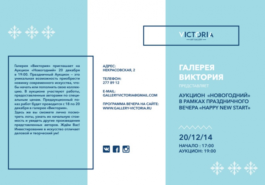 20 декабря галерея «Виктория» приглашает на новогоднюю вечеринку, в рамках которой будут проводиться новогодние мастер-классы, культурные итоги года, новогодний аукцион современного искусства, концертная программа.
