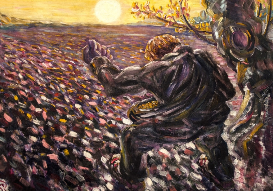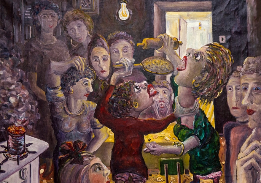 Герои картин фактурны, способны на реальные поступки, хотя выглядят как в пластилиновом мультфильме. Мелкие предметы, которые художник использует (пуговицы, веревки, шелуха от семечек), еще более оживляют картины. Жизнь будто стремится наружу.